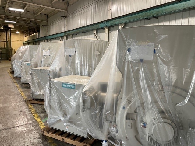 Brand new Siemens induction motors and have been stored indoors. They have all been on a preservation maintenance schedule which has included the heating elements being plugged in, the oil changed quarterly and the shafts rotated monthly. 6500 hp, 6600 volt 1792 rpm.