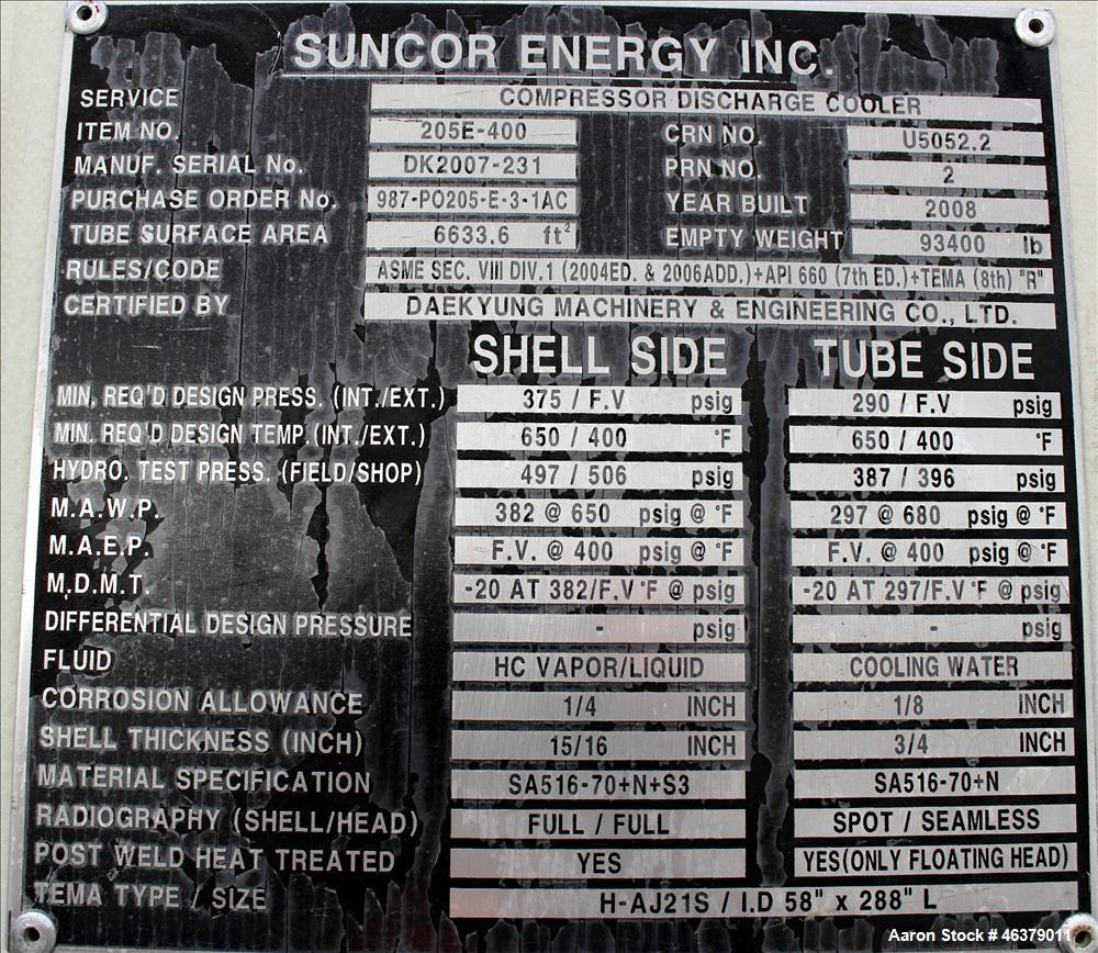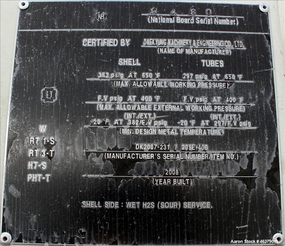 unused- 4 pass shell & tube heat exchanger, 6,633 square feet, carbon steel, horizontal. shell rated 382 psi/ full vacuum at -20 to 650 degrees f. (1122) 1" diameter x 24' long tubes rated 297 psi/ full vacuum at -20 to 650 degrees f. openings: shell (2) 20", (1) 24"; tubes (2) 14". saddle mounted. mfg. daekyung machinery & engineering. serial# dk2007-231. national board # 2480. built 2008.
