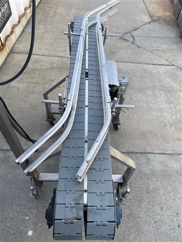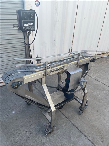 Stainless steel portable belt conveyor with (2) 3-1/4" wide X 54" long plastic belts running side by side on common stainless-steel frame. Includes guide rails on each end with slight turns. Frame is mounted on leg. Offered with Motor Master 20000 Series variable speed controller with 1/2 HP, 1750 RPM, 90 Volt motor. ...more