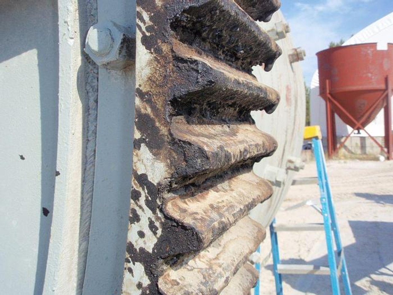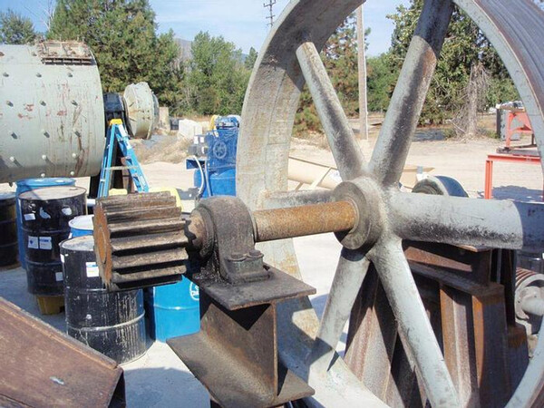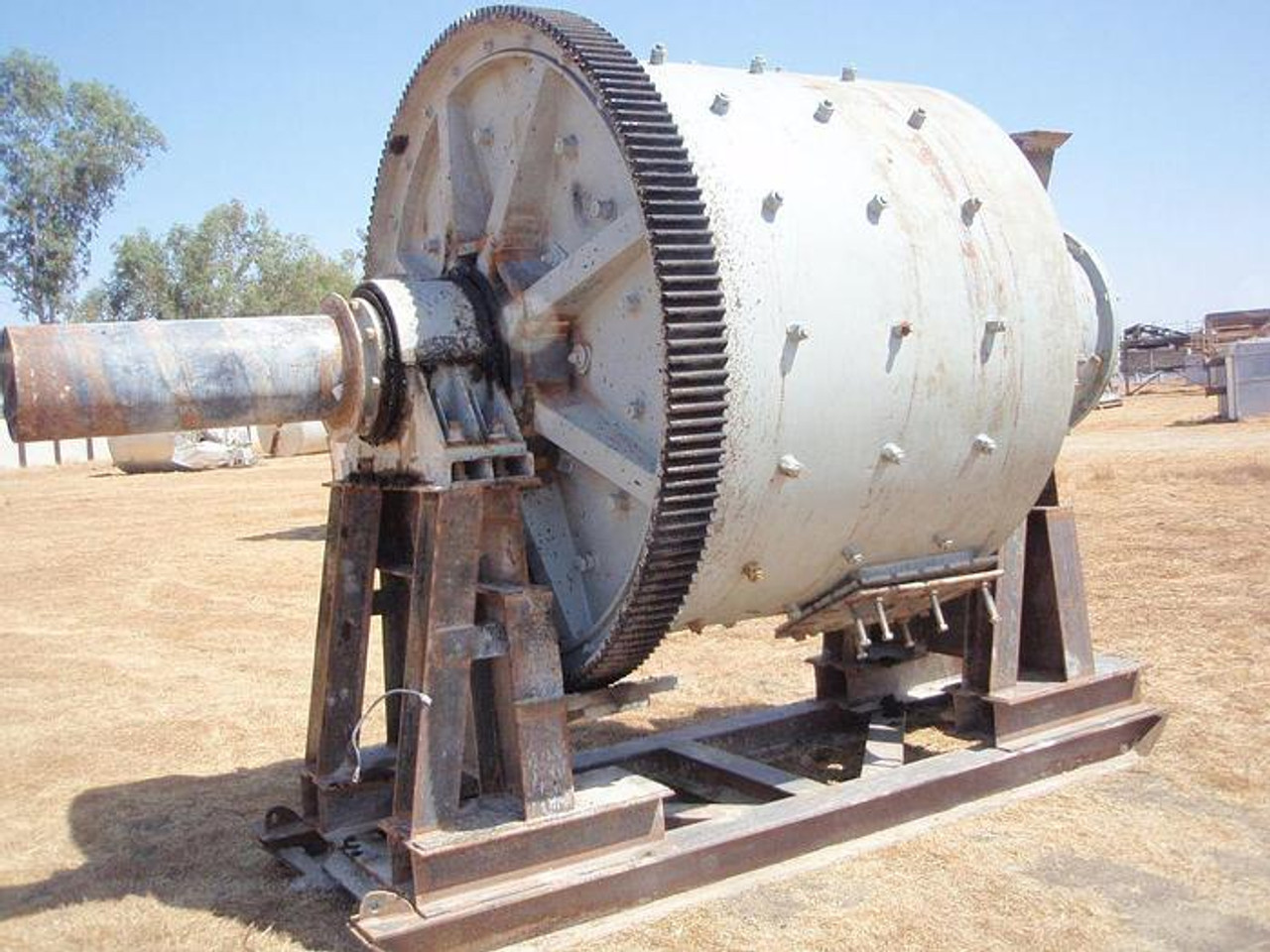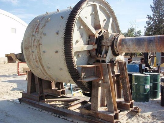 Marcy 8' diameter x 6' long ball mill with trunnion feed and discharge. Rubber liners and lifters. Last used in a wet grind application. Previously driven by 250 HP motor thru gear & pinion. Gears good. Lots of wear on (1) of the trunnions. Mill serial number 700. Previously used in silica sands ...more
