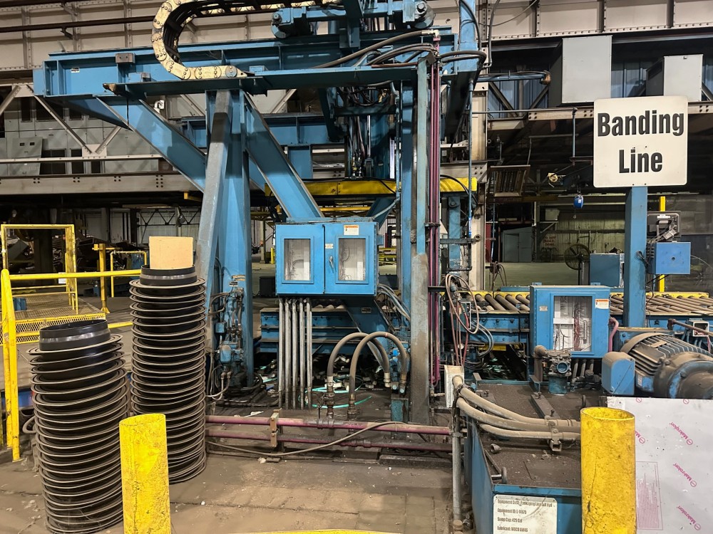 10000 lb. Stamco banding line, 72" OD, includes 4-arm turnstile, pick-n-place downlayer conveyor