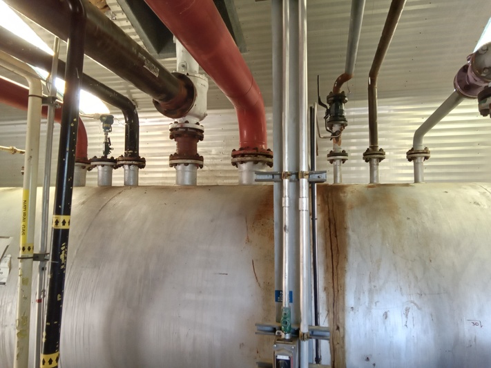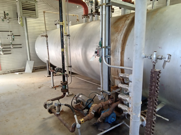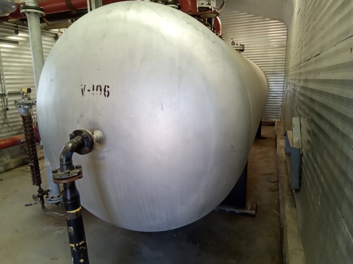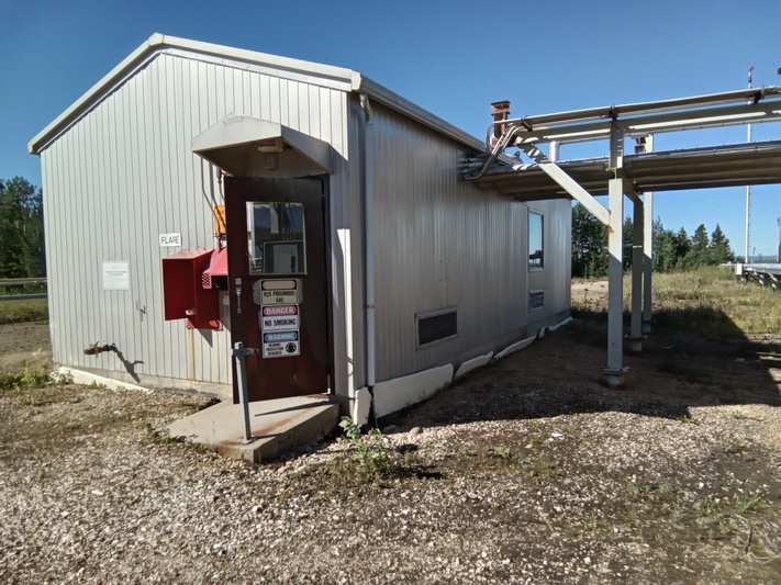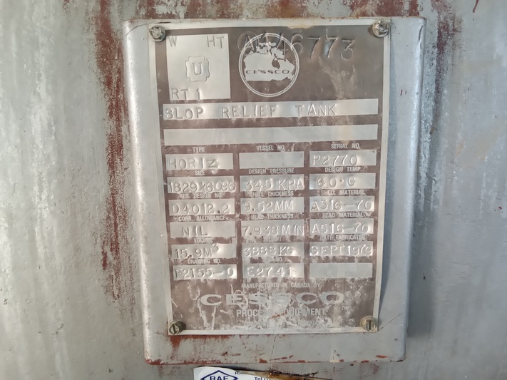 Available for sale is a Cessco slop relief tank, housed in a building with a compressor flare scrubber. The tank features a diameter of 72 inches and was built in 1979. It operates under sour service conditions and is currently connected and operational. The building dimensions are 16.5 ft wide, 13 ft high, and 36 ft long, with heating capabilities.