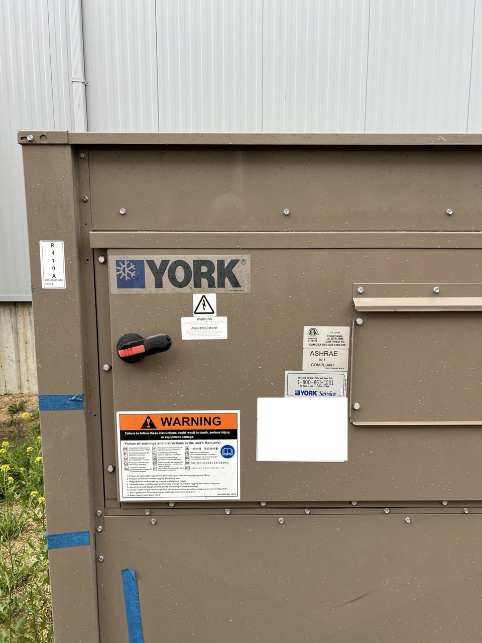 The York YCUL0072EE is a 72-ton commercial rooftop air-cooled chiller designed for high-capacity HVAC applications in light industrial and commercial environments. The unit features dual refrigeration circuits for staging and redundancy, runs on R-410A, and is ASHRAE 90.1 compliant. This 2019 unit includes a factory-installed fused disconnect and appears to have been outdoor-stored on pad mounts, with fair external condition.