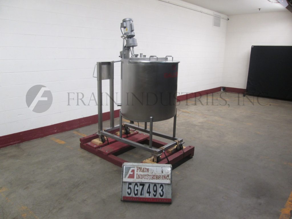 75 gallon capacity, 304 stainless steel single wall tank. Vessel dimensions: 32" diameter x 29" deep with slant style bottom. Equipped with flip up covers, and a .33 Hp side mounted prop agitator. Unit mounted on a 48" x 24" stainless steel base with casters and a 2½" OD / 2" ID Tri-clamp style bottom discharge with 20" ground clearance.