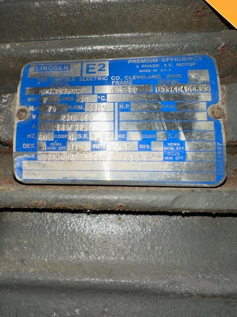75 HP 1185 RPM Lincoln Motors, Frame 485T, 230/460 Volts, Squirrel Cage, Refurb