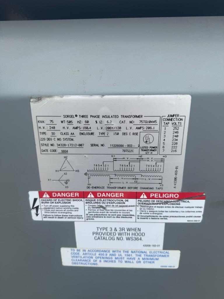 75 KVA 240 Delta Primary, 208Y/120 Secondary, 3 phase, Dry Type Transformer, Ready To Ship (3 available)