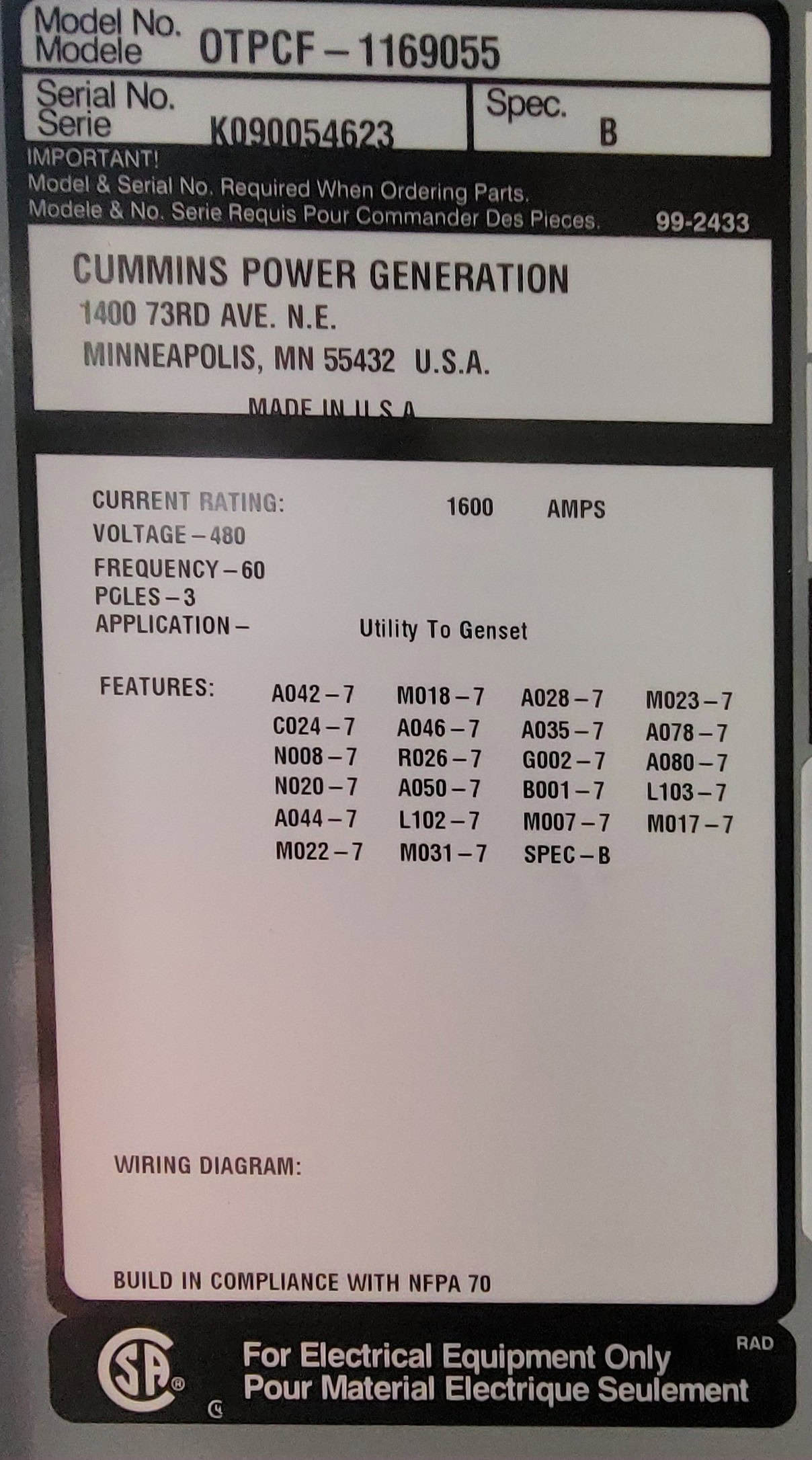 1600 Amp. Cummins OTPCF-1169039, automatic transfer switch, 480 Volts, 3P, type 1 enclosure (2 available)