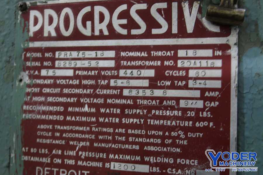75 KVA Progressive #PRA75-18, spot welder, 18" throat, digital display, 1200 lb.force, #71254 Manufacturer: Progressive Model: PRA75-18 KVA: 75 Stock # 71254 Request a Quote 10 For Sale by Yoder Machinery Sales Surplus Record Dealer Since 1960 Contact Seller Holland, OH Sales 866-69...> Show Seller's Phone Number 866-692-8933 Let the seller know you found their listing on Surplus Record! View More Yoder Machinery Sales ' ListingsDescriptionSERIAL ..................... 8289-52MODEL ...................... PRA75-18KVA ........................ 75THROAT ..................... 18"MAXIMUM WELDING FORCE ...... 1200 LBSPRIMARY VOLTS .............. 440SECONDARY VOLTAGE HIGH TAP . 5-8LOW TAP .................... 3-4DIGITAL DISPLAY ............ YES Request More Information from SellerGet Your Price from Yoder Machinery Sales! "*" indicates required fieldsName*Company*Email* PhoneZip / Postal Code*QuestionMake an OfferRequests Send me a shipping quote I am interested in financingSend Copy Email me a confirmation of this inquiryBuyer Protection Use our partner Escrow.com to buy or sell equipment safelyBuyer Protection Send me info about buyer protectionThis field is hidden when viewing the formDealer Email Buyers Who Viewed This Listing Also Viewed …JUST ADDED! 75 KVA T. J. Snow, Spot Welder, 8" x 8" platen, 18" throat, 12 GPM @ 35 psi, Entron EN1000 control, 480 Volts, 2017Category: Press Type Spot WeldersSeller: Timco IncLocation: Columbia, TN Mfr: T.J. SnowYear: 2017TJ SNOW 75 KVA SPOT WELDER, STOCK# 14473J, S/N# UM002590, NEW 2017, 75 KVA, 8" x 8" PLATEN, 18" THROAT, MAX SEC VOLTS 10.0, MAX SEC VOLTS 5.7, MIN WATER FLOW 12 GPM @ 35 PSI, ENTRON EN1000 CONTROL, PALM BUTTONS, 480 V, 48" LR X 58" FB X 95" TALL, APPROX 5,000 LBS. 75 KVA Federal #RA-3-36, spot welder, S/N 57W2512Category: Press Type Spot WeldersSeller: Bay Area CNC MachineryLocation: Walnut Creek, CA Mfr: FederalModel: RA-3-36Condition UsedStock Number 47518888149. 75 KVA Federal #PA-1-18/24, spot welder, 220/440 V., 30" throatCategory: Press Type Spot WeldersSeller: Smith Machinery CoLocation: Ames, IA Mfr: FederalModel: PA-1-18/24Throat 26 inches, VOLTS 440, CYCLE 60, CONTROL VOLTS 440/220, MINIMUM WATER, INLET PRESSURE 50 POUNDS AT 70°F., WITH MILLER COOLMATE 4. 75 KVA Chowel #ASR-75A, 12" throat, from service, 460 V., one owner, 11/2006, Tag #16362Category: Press Type Spot WeldersSeller: Yeoman Machinery CorpLocation: Elkhart, IN Mfr: ChowelModel: ASR-75AYear: 2006 75 KVA Banner #PR.SP.PROJ, spot welder, 13.5"throat, 6.5"x6.5" platen, Weldtron ControlCategory: Press Type Spot WeldersSeller: D & D Industries IncLocation: Monclova, OH Mfr: BannerModel: PR.SP.PROJ75 KVA, 6.5" X 6.5" PLATEN, 13.5" THROAT, MAX SEC VOLTS 8.0, MAX SEC VOLTS 4.0, WELDTRON CONTROLS S/N 115019, PALM BUTTONS, EXAUST FAN, LIGHT CURTIANS, 440 V, 48" LR X 58" FB X 95" T, 5000 LBS APROX WEIGHT.Share × "*" indicates required fieldsYour Name*Your Email* Recipient's Email* Note to Recipient