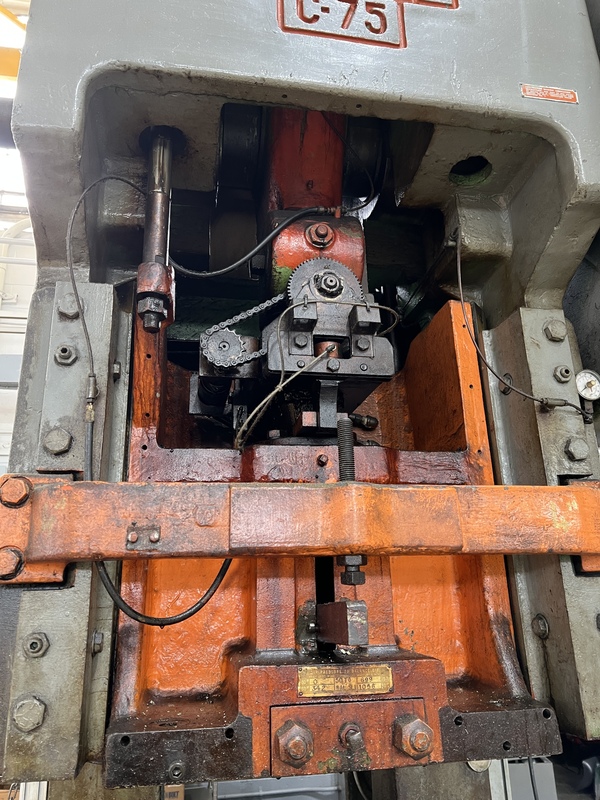 MODEL #: C-75, SERIAL #: H-68906, 4" STROKE, 3.5" RAM ADJUSTMENT, 15" SHUT HEIGHT, 100 SPM, 24" x 19" RAM, 36" x 24" BED, AIR CLUTCH, AIR BRAKE, AIR COUNTERBALANCES, PALM BUTTONS, 1979, GOOD CONDITION 78" LR x 94" FB x 127" TALL APPROXIMATE WEIGHT 17,500 LBS.