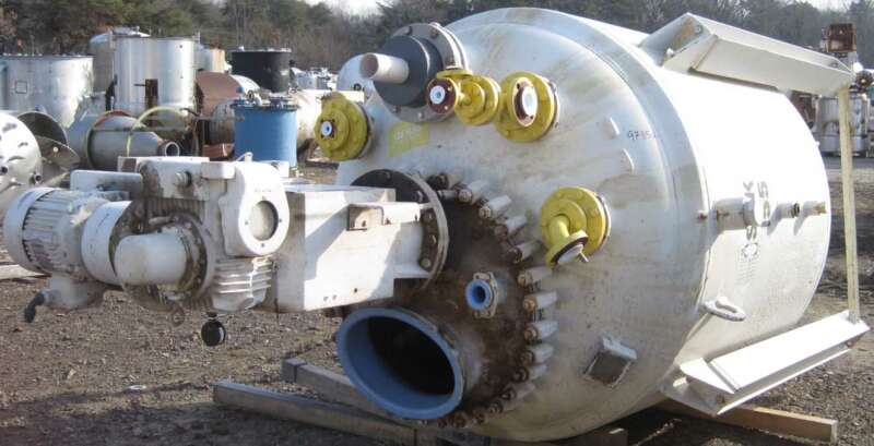 used- 700 gallon dci reactor, 316 stainless steel construction, approximately 48" diameter x 84" straight side, dish top and bottom, rated 35 psi and full vacuum at 358 f internal, jacketed on bottom head only for 135 psi and full vacuum at 358 f, on legs, 18" manway, (3)3", (2)1.5", 1" top nozzles, 3" bottom outlet. ...more