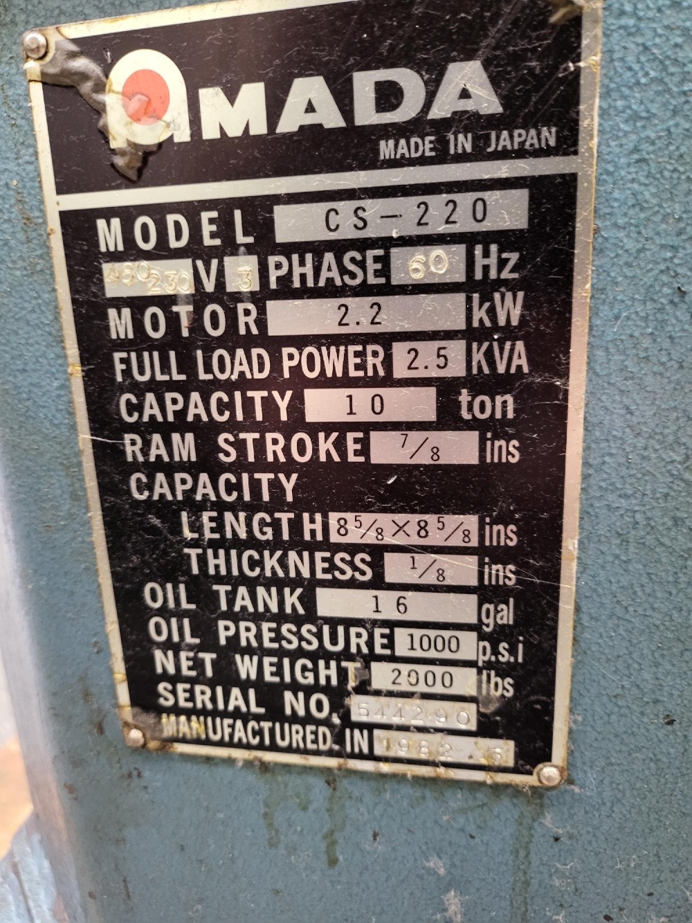 8" X 8" X 1/8" AMADA MODEL #CS-220 CORNER NOTCHER. RATED CAPACITY. 10 TON. HEIGHT OF TABLE. Weight 2600 LBS. STROKERS PER MINUTE. 36. RAM STROKE. COPER TABLE..