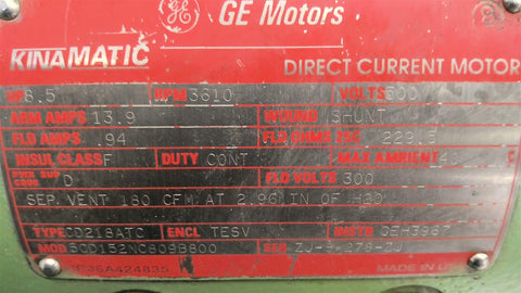 GE 5CD152NC809B800 8.5HP DC Motor 3610 RPM CD218ATC 500 ARM V 300 FLD V TESV V115R-2000-815-B-CL-R Encoder Shaft L-3" OD 1 3/8"-Used--Good Visual Condition---5/24/JLVSS283-S2-3-1-4-C---CC 152820---300.00#