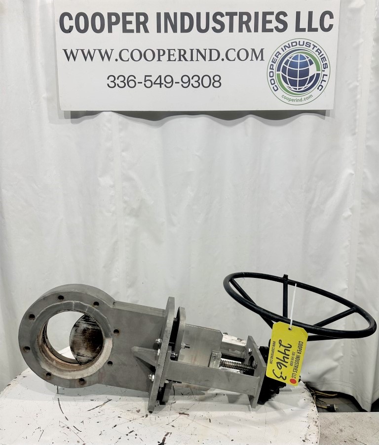 ITEM 2968: 8” LORENZ STAINLESS MANUAL KNIFE GATE, MODEL: MGR-800-AL-RD-HC, SN: D-50609-01-002, 8” DIAMETER INLET/OUTLET, 4 ¼” TALL INLET TO OUTLET, 13 ½” MOUNTING FLANGE, ALUMINUM CONSTRUCTION, MANUAL ACTUATION, PRICE, FOB HAW RIVER, NC………. $ 700.00.
