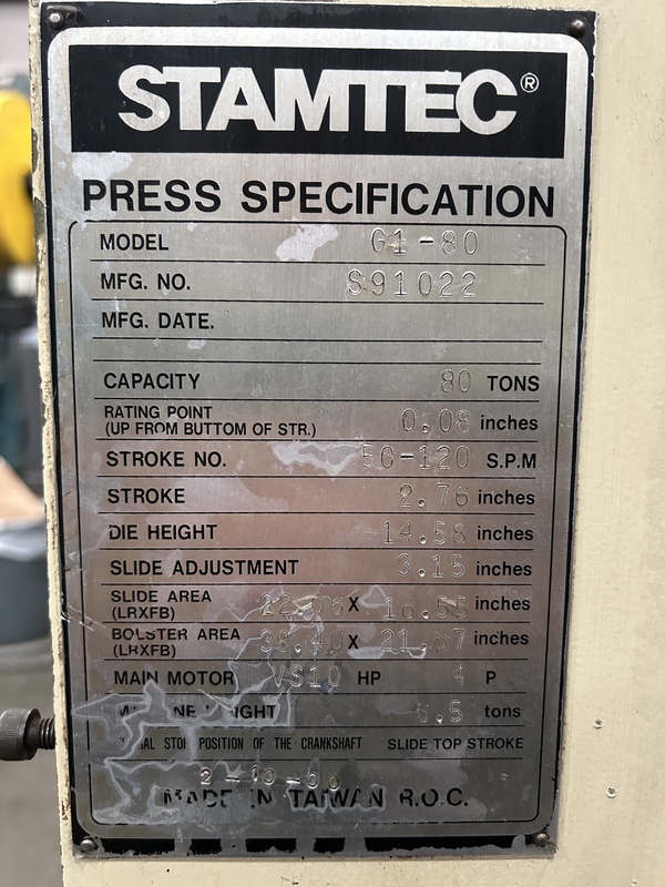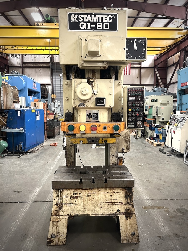 SERIAL. 0394, MODEL. G1-80, YEAR NEW., CAPACITY. 80 TON, AREA OF BED. 39.50" X 21.50, AREA OF T SLOTTED RAM. 22" X 17", STROKE. 5.91, SHUT HEIGHT (SDAU). 13", BOLSTER PLATE T SLOTTED. 39.50 X 21.5" X 4", RAM ADJUSTMENT (MOTORIZED). 2.52", STROKES PER MINUTE (VARIABLE). 35 TO 80, AIR CLUTCH. YES, AIR COUNTERBALANCE. ...more
