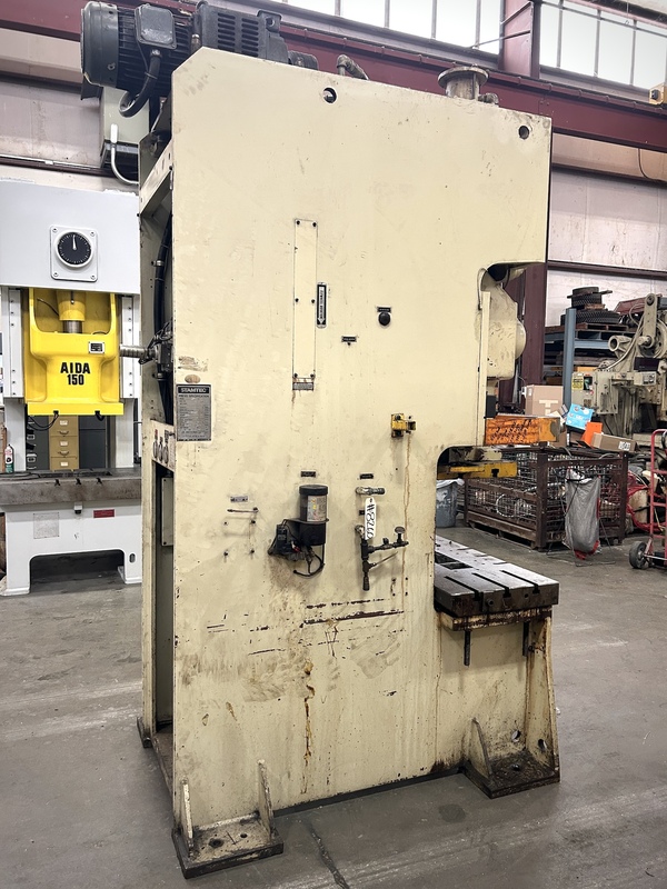 | CAPACITY | 88 US TON | STROKE | 2.8" | MAX DIE HEIGHT | 14.6" SDAU OVER | BED AREA | 39.4" RL X 21.7" FB | SPEED | 50 - 120 SPM | SLIDE ADJUSTMENT | 3.2" MOTORIZED | SLIDE AREA | 22.1" RL X 16.5" FB (T-SLOTTED) | BOLSTER PLATE | 39.4" RL X 21.7" FB (T-SLOTTED) | DISTANCE BETWEEN UPRIGHTS | 21" | DISTANCE FLOOR TO BED | 29" | CLUTCH | STAMTEC AIR CLUTCH / BRAKE COMBINATION | ELECTRICS | 10 HP 1750 RPM 240/480V-3-60 EDDY CURRENT DRIVE & STAMTEC PRESS CONTROL | APPROX DIMENSIONS | 125" H (INCL MOTOR) X 60" RL X 75" FB | APPROX WEIGHT | 14,500 lbs | Equipped With | HYDRAULIC OVERLOAD PROTECTION, LOW DEFLECTION, SUPER RIGID STEEL FRAME, EXTRA LONG 6 PT CENTERED GIBS, REMOVABLE BOLSTER & SLIDE PLATE, AUTOMATIC LUBRICATION SYSTEM, DUAL AIR COUNTERBALANCES, SINGLE BACK GEARED DESIGN, FLOOR STANDING | Note |