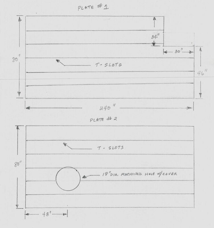 Length: 86.61", Width: 157.48", Total Pad Size: 173.22" x 157.48", Thickness: 11.81", Number of T-Slots, Per Plate: 8, Distance Between T-Slots: 9.8", Dia. of Hole in Center of Plates: 30", Type of Material: Cast Iron, Table Weight: 16,300 lbs each, Leveler/ Anchors, Center Hole, MATERIAL:, Heat Treament: Annealling ...more