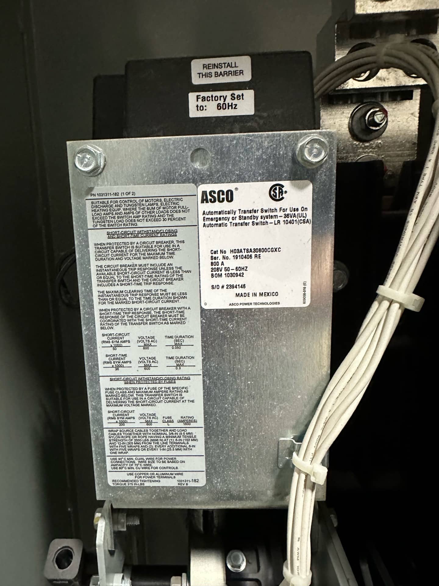 Manufacturer ASCO Equipment Type ATS Model Family 300 Series Model # A300380091XC Serial Number 901956001 Rating (Amps) 800 Amps Voltage 480 Phase 3 Pole 3 Frequency 60 Hz Enclosure Type Nema 1 Status In Stock.