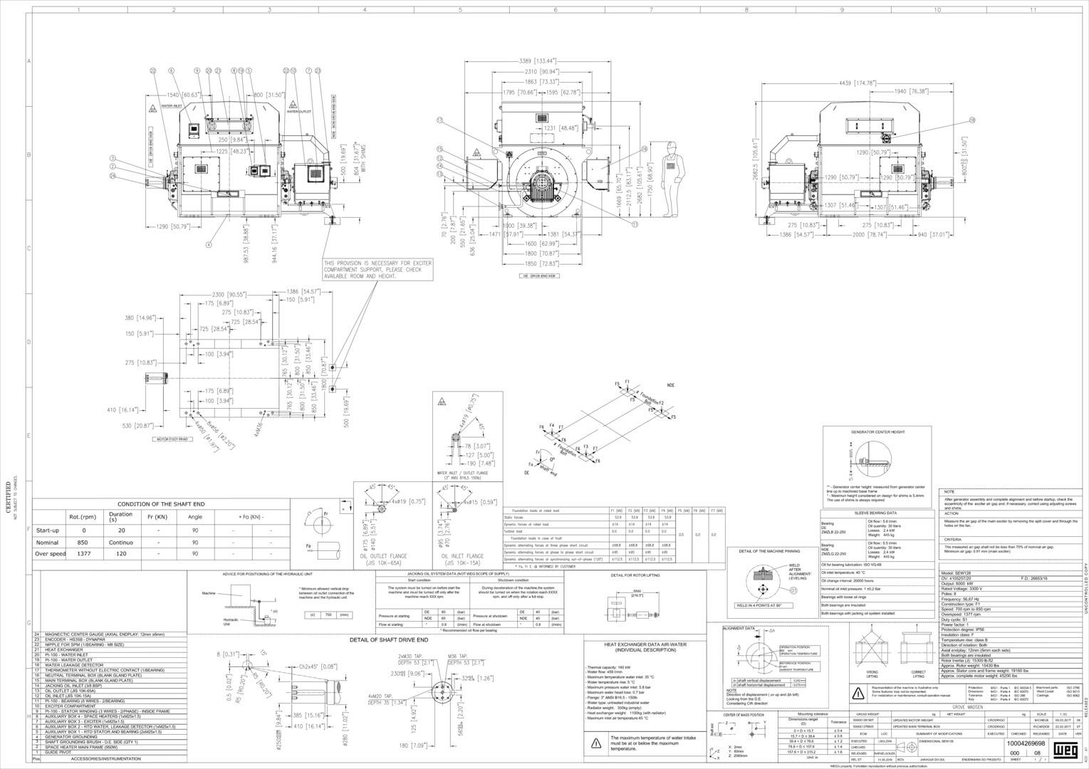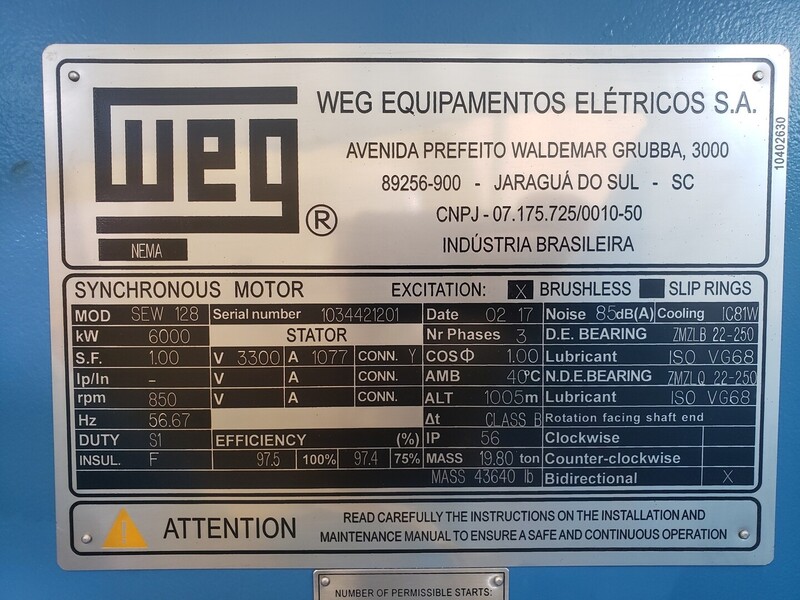 8000 HP 850 RPM Weg sew 128, Frame 1007A, synchronous, 3300 Volts, new surplus, 2017 Manufacturer: Sew Frame: 1007A Year: 2017 HP: 8000 RPM: 850 Volts: 3300 - 3300 Stock # 101086 Price: $623,050 USD Request Info 4 For Sale by Lenmark Industries Surplus Record Dealer Since 2024 Contact Seller Langley, BC Canada Lenmark Sales 778-65...> Show Seller's Phone Number 778-653-5801 Let the seller know you found their listing on Surplus Record! View More Lenmark Industries ' ListingsDescription SKU: 101086Model: SEW 128Year: 2017Condition: Surplus NewS/N: 1034421201General Specifications: Current Type: AC Phase: 3-phase RPM: 850 rpm Made In: BRAZILDimensions: 109.00 (H) x 137.00 (W) x 178.00 (L) inchesAdditional Description:Voltage: 3300 VPower: 6000 kWCurrent: 1077 APoles: 8Frequency: 56.67 HzOverspeed: 1377 rpmDuty Cycle: S1Insulation Class: FProtection Rating: IP56Ambient Temp.: 40oCNoise: 85 dB(A)Cooling: IC81WRotation: Bidirectional Request More Information from SellerInquire Further with Lenmark Industries! "*" indicates required fieldsName*Company*Email* PhoneZip / Postal Code*QuestionMake an OfferRequests Send me a shipping quote I am interested in financingSend Copy Email me a confirmation of this inquiryBuyer Protection Use our partner Escrow.com to buy or sell equipment safelyBuyer Protection Send me info about buyer protectionThis field is hidden when viewing the formDealer Email Buyers Who Viewed This Listing Also Viewed … 8043 HP 850 RPM Weg, Synchronous Motor, newCategory: 60 Hz Synchronous Electric MotorsSeller: A M King IndustriesLocation: Oroville, CA Mfr: WegUNUSED WEG 6000 kW (8,043 HP) Synchronous Motor, 850 RPM. 8000 HP 327 RPM Electric Machinery, Frame 106, 1.0 PF, 12470 Volts (2 available)Category: 60 Hz Synchronous Electric MotorsSeller: East Coast Electrical Eq.Inc.Location: Youngsville, NC Mfr: Electric MachineryFrame: 106 8000 HP 1800 RPM GEC Alsthom, Frame DM710G1800P, synchronous motor, 13800 VoltsCategory: 60 Hz Synchronous Electric MotorsSeller: Tiger DemolitionLocation: Saint Amant, LA Mfr: GecFrame: DM710G1800P 9400 HP 1800 RPM Abb, Frame 1000, TEWAC, 6600 VoltsCategory: 60 Hz Synchronous Electric MotorsSeller: Pump & Motor WorksLocation: Okmulgee, OK Mfr: AbbFrame: 1000 8000 HP 1800 RPM GEC Alsthom, Frame DM710G1800P, synchronous motor, 13800 VoltsCategory: 60 Hz Synchronous Electric MotorsSeller: Tiger DemolitionLocation: Saint Amant, LA Mfr: GecFrame: DM710G1800PShare × "*" indicates required fieldsYour Name*Your Email* Recipient's Email* Note to Recipient