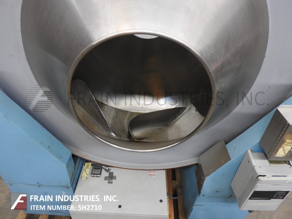 Pellegrini, 86" Diameter, stainless steel, coating pan. Equipped with 86" diameter x 76" deep pan with (8) 10" high baffles, (2) 28" diameter access ports, removable discharge chute and 35" diameter x 26" deep discharging hopper. Control panel with variable speed controls and timer.