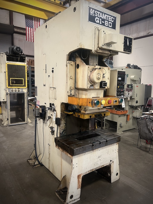 SERIAL. 0394, MODEL. G1-80, YEAR NEW., CAPACITY. 80 TON, AREA OF BED. 39.50" X 21.50, AREA OF T SLOTTED RAM. 22" X 17", STROKE. 5.91, SHUT HEIGHT (SDAU). 13", BOLSTER PLATE T SLOTTED. 39.50 X 21.5" X 4", RAM ADJUSTMENT (MOTORIZED). 2.52", STROKES PER MINUTE (VARIABLE). 35 TO 80, AIR CLUTCH. YES, AIR COUNTERBALANCE. ...more