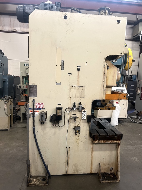 | capacity | 88 us ton | stroke | 2.8" | max die height | 14.6" SDAU OVER 4" H BOLSTER | bed area | 39.4" X 21.7" (RL X FB) | speed | 50 - 120 SPM | slide adjustment | 3.2" MOTORIZED | slide area | 22.1" X 16.6" (RL X FB) T-SLOTTED | bolster plate | 39.4" x 21.7" (RL X FB) 4" THICK t-slotted | distance between uprights | 21" | distance floor to bed | 29" | shank hole size | 1.97" diameter | clutch | STAMTEC AIR CLUTCH / BRAKE COMBINATION | electrics | 10 HP 1750 RPM 240/480V-3-60 EDDY CURRENT DRIVE & STAMTEC PRESS CONTROL | approx dimensions | 60" X 75" (RL X FB) X 125" HIGH INCLUDING MOTOR | approx weight | 15,500 lbs | Equipped With | HYDRAULIC OVERLOAD PROTECTION, LOW DEFLECTION, SUPER RIGID STEEL FRAME, EXTRA LONG 6 PT CENTERED GIBS, REMOVABLE BOLSTER & SLIDE PLATE, AUTOMATIC LUBRICATION SYSTEM, DUAL AIR COUNTERBALANCES, SINGLE BACK GEARED DESIGN, FLOOR STANDING | Note |