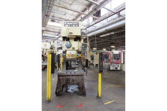 STAMTEC 88 TON GAP FRAME PRESS, STOCK# 14246J, MDL#G1-80, S/N# A10321 B01-SOO1197, CAPACITY 88 TON, 5.91" STROKE, 13" SHUTHEIGHT, 3.15" RAM ADJUSTMENT POWERED, 35-80 SPM, 22.05" X 16.54" RAM, 39.37" X 21.65" BED, AIR CLUTCH, AIR BRAKE, AIR COUNTERBALANCE, HYD OVERLOADS, PRESS PADS, PALM BUTTONS, WINTRESS SMART PAC 2 ...more