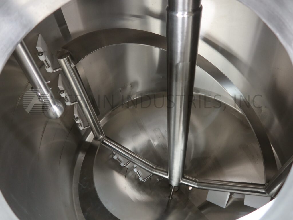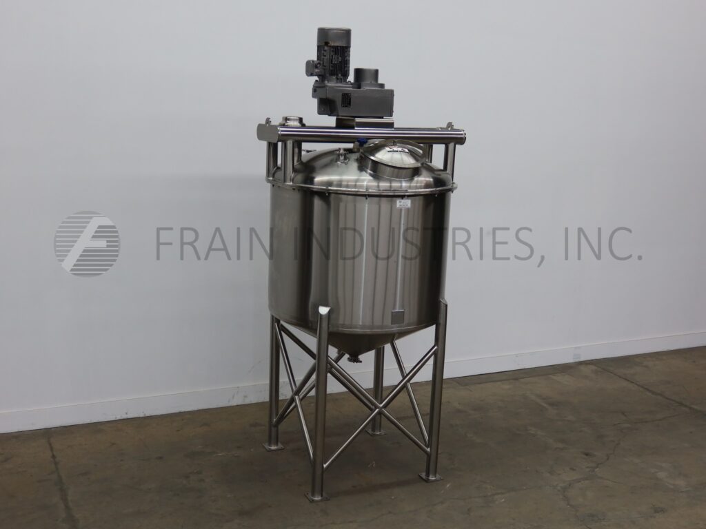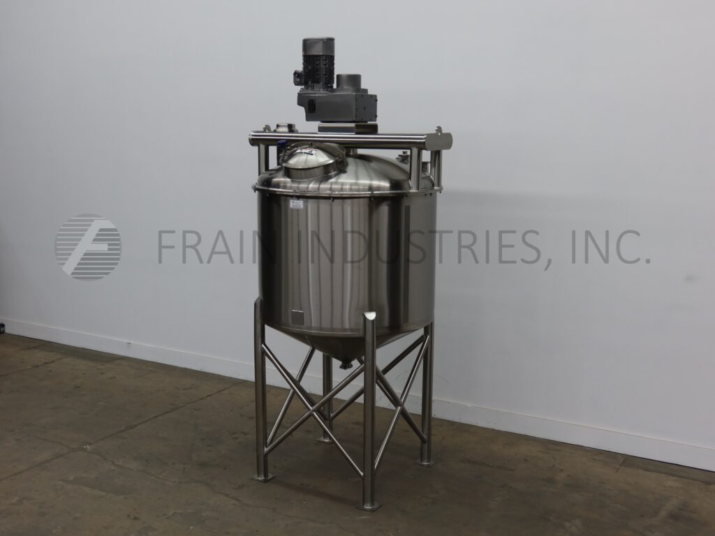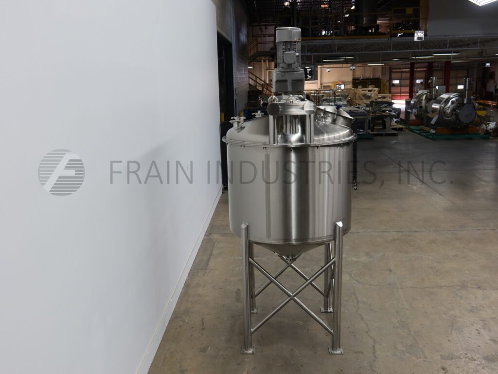 A & B Process Systems, 400 gallon capacity, 304 stainless steel single wall tank. Vessel dimensions: 56" diameter x 57" deep with a 40" straight wall. Equipped with scrape agitation powered by a 7½ hp drive, (2) CIP spray balls supplied by 2"OD / 1½"ID Tri Clamp fitting and thermowell. Cone bottom has 3½" OD / 3" ID tri-clamp center bottom discharge with 36" ground clearance.