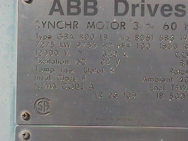 - Unused surplus synchronous motor, - 2 units available, - Purchased as a standby spare, never installed, - Dual frequency: 50 or 60 Hz, - 936DO Frame, - Type TS, - 3300 Volt, - 7,500 kW (10,000 HP), - Insulation class F, - Power factor 1.0, - Self ventilation enclosure, - Variable speed operation, Dual frequency : ...more