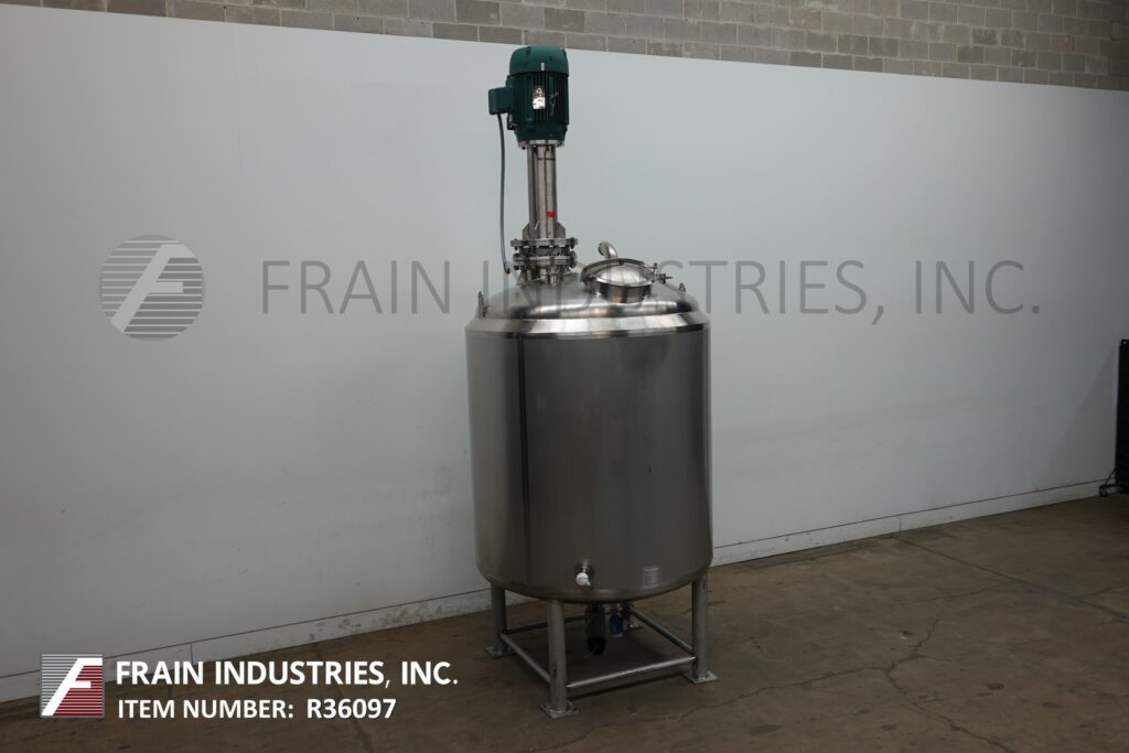 A & B Process System, 1000 gallon capacity, 304 stainless steel single wall process tank. Vessel dimensions: 64" diameter x 70" straight wall. Equipped with a 18" OD top hinged man way, (2) CIP spray balls supplied by 2½"OD / 2"ID Tri-clamp fittings, 40 Hp top mounted high shear agitator, (1) thermowell, (1) flush mount sensor and flush valve 4½"OD / 4" ID Tri-Clamp discharge with 19" ground clearance.