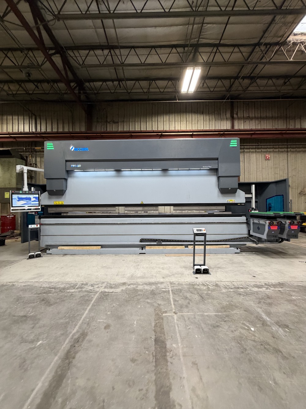 Spec, Tonnage: 352 T, Type: HYD, Overall Length: 12.34′, Between Housings: 128″, Stroke: 14.8″, # Axis: 4, Dimensions: 200.8″ L x 110.2″ W x 124″ H, Weight: 45000, Control: CNC (DELEM 58T), Model: Ermak PowerBend FALCON 3760-320, Tonnage: 352 US Tons, Bending Length: 12’ ...more