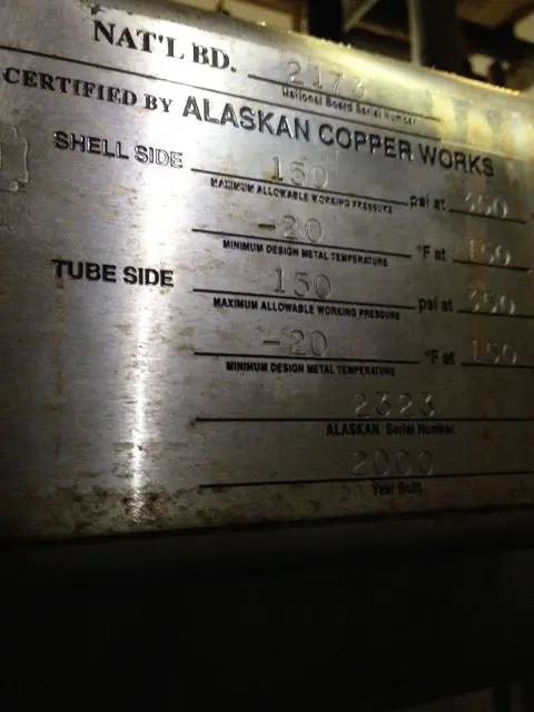Advance Process Sterilizer Unit. S/N: 2330. Stainless steel, (2) tube in tube heat exchangers, (1) cooling tube, 150 psi @ 400F, 18 in. dia x 20 ft. L, (2) AGC ProHX-F plate heat exchangers, connecting valve & steam trap. Certified by Alaskan Copper Works. Shell: 150 PSI at 350F, -20F at 150 PSI. Tubes: 150 PSI at 350F, -20F at 150 PSI. Year: 2000. S/N: 2323.