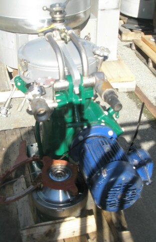 Alfa Laval Model MAB 103B24 continuous, solid retaining (3) separator centrifuge, capable of doing up to 1150 liters or 300 gallons per hour of product per hour – depending on materials and application. Capable of seperating out solids, liquids and sediments and has 1 Hp motor drive. Mounted on a painted base ...more