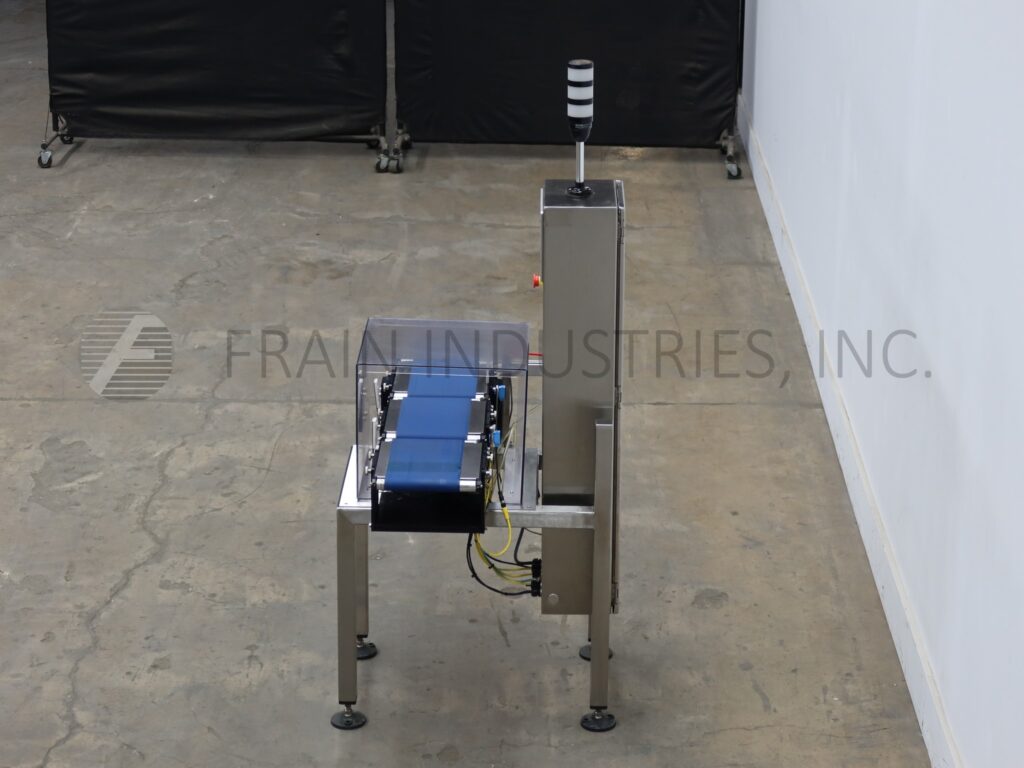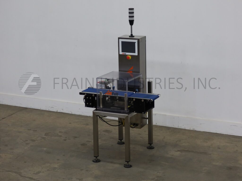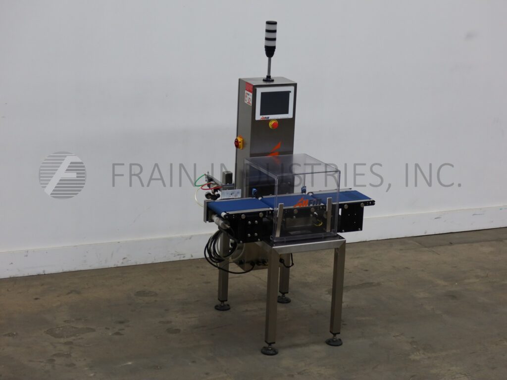 All Fill, Alpha Model PW12, stainless steel, checkweigher with number of packages per minute – depending on materials and application. Push Arm Reject. Digital strain gage load cell, capable of handling packages up to 12" in Length; 8" in Width and from 5 grams to 3628 grams (8 lbs) with accuracy of + / – 1 grams depending on product. Equipped with 12" long x 8" wide in feed and discharge conveyors and 12" long x 8" wide load cell conveyor with lexan cover over load cell. Control panel has data entry via 10" COLOR touch screen with audible response, alphanumeric display plus individual weight display with push button operator interface and is direct feedback control capable, with 100 programmable product set-ups memory and statis light bar. Mounted on stainless steel frame with height adjustable legs.
