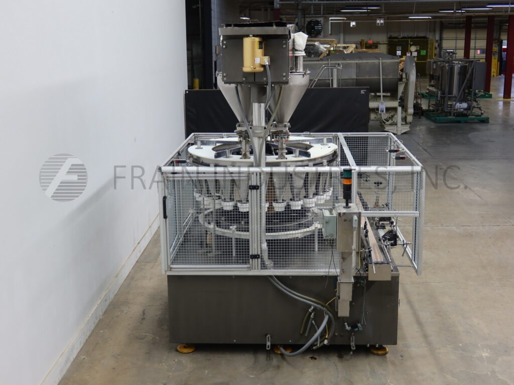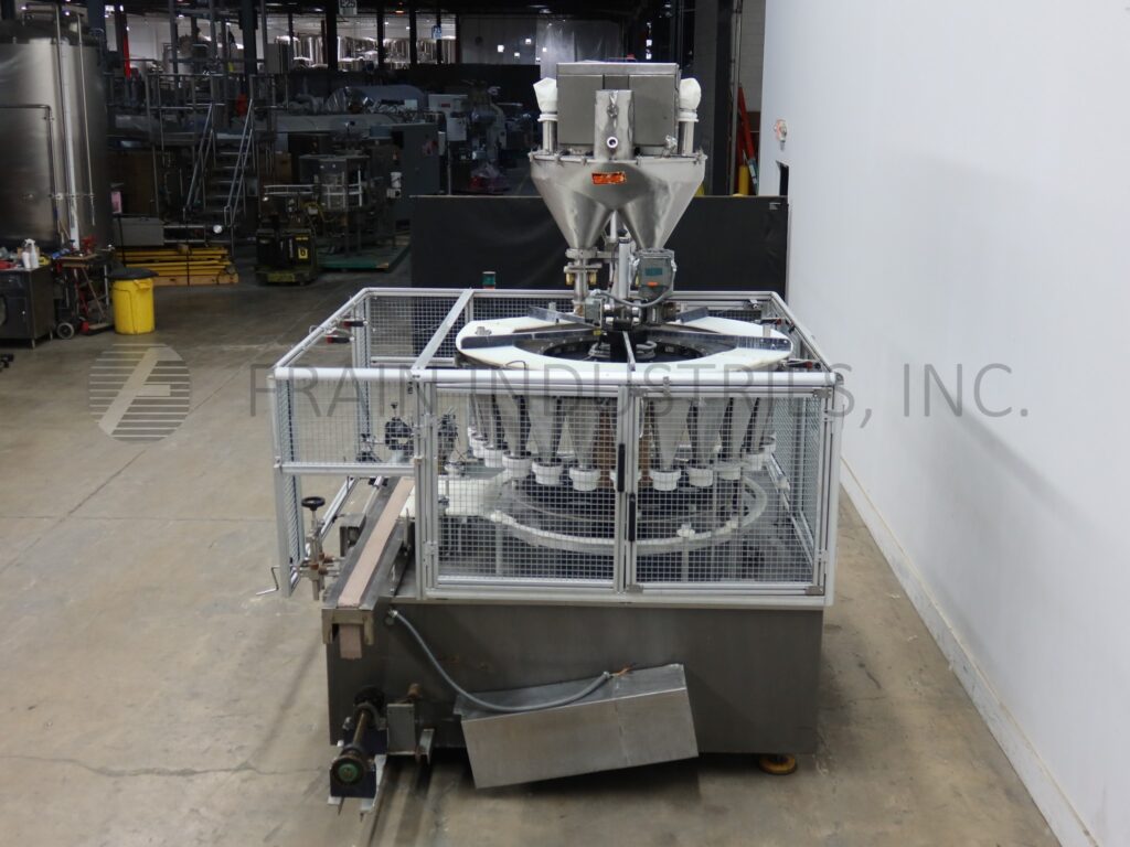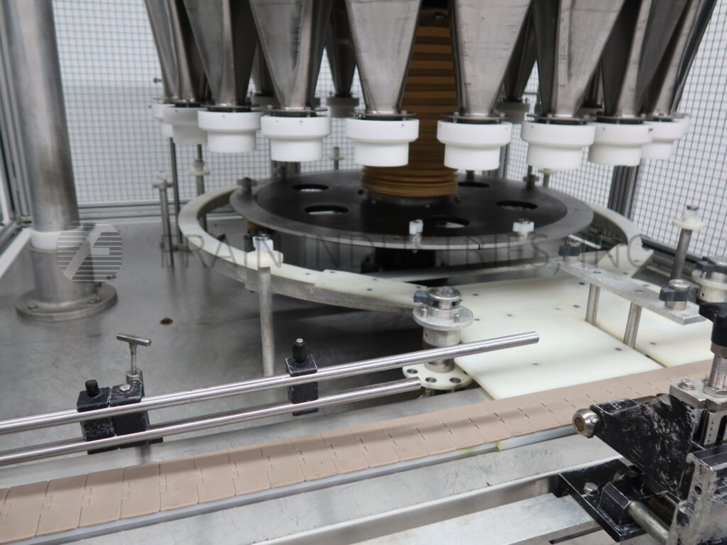 All Fill, Model R-242, dual head, 24 filling stations, rotary, continous motion, stainless steel auger filler. Rated up to 400 containers per minute – depending on materials, application and machine configuration. Container size up to 6½" in diameter with proper change parts. Equipped with 3" wide x 114" long Delrin through conveyor, 24" long worm screw to star wheel indexing, dual auger fillers, 60" OD turret with (24) 2½" ID funnels set on 7" centers. Control panel with touch screen HMI and statis light bar. Mounted on heavy duty stainless steel frame with leveling legs and cage style safety guarding.