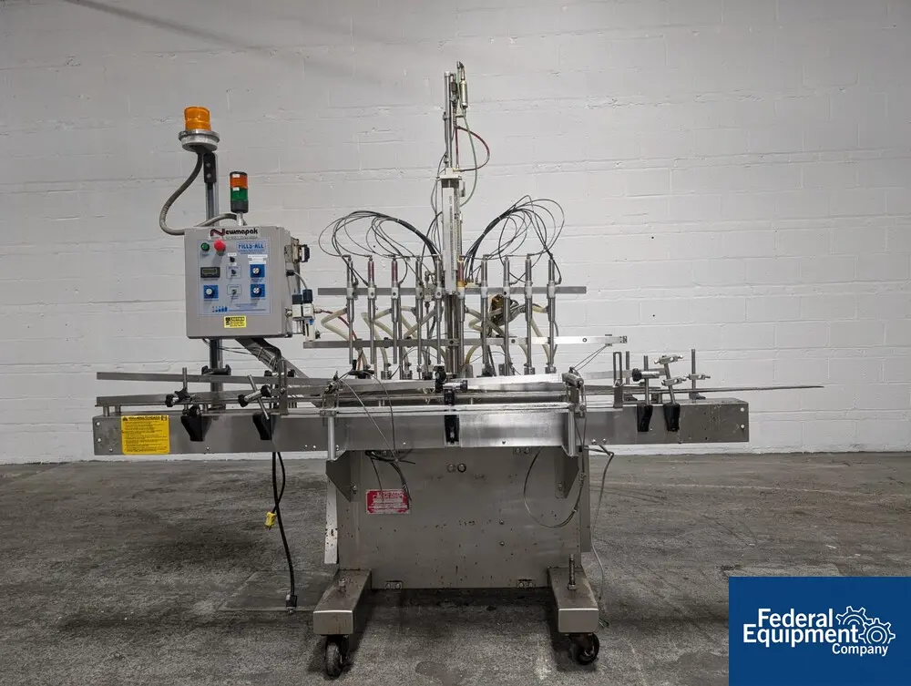 Used Kaps-All inline volumetric piston filler, model VOL-32-8, (10) head with individual piston for each fill nozzle, currently set up with 600cc/20 oz pistons, giving speeds up to 50 bottles/minute, Fills-All controls, with diving and non-diving filling action, integrated approximately 19' long conveyor section, stainless steel product feed tank, serial# 3475.