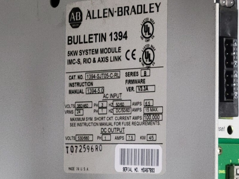 Allen-Bradley, 1394-SJT05-C-RL, Digital Servo Controller, 380/460 Volts Manufacturer: Allen-Bradley Model: 1394-SJT05-C-RL Type: 1394-sjt05-c-rl Volts: 380 Stock # 25771 Price: $2,342 USD Request Info 5 For Sale by Lenmark Industries Surplus Record Dealer Since 2024 Contact Seller Langley, BC Canada Lenmark Sales 778-65...> Show Seller's Phone Number 778-653-5801 Let the seller know you found their listing on Surplus Record! View More Lenmark Industries ' ListingsDescription SKU: 25771Model: 1394-SJT05-C-RLCondition: UsedAdditional Description:AC InputVolts: 380/460Amp: 6.5Phase: 3-PhaseDC InputVolts: 530/680Amp: 7.5Phase: Single-PhasePower: 5 kW Request More Information from SellerInquire Further with Lenmark Industries! "*" indicates required fieldsName*Company*Email* PhoneZip / Postal Code*QuestionMake an OfferRequests Send me a shipping quote I am interested in financingSend Copy Email me a confirmation of this inquiryBuyer Protection Use our partner Escrow.com to buy or sell equipment safelyBuyer Protection Send me info about buyer protectionThis field is hidden when viewing the formDealer Email Buyers Who Viewed This Listing Also Viewed …JUST ADDED! Siemens, 6SL3130-7TE31-2AA3, Drive, 120 kW, 380-480 Volts.Input, 510-720 Volts.OutputCategory: AC Variable Frequency DrivesSeller: HGR24Location: Euclid, OH Mfr: SiemensModel: 6SL3130-7TE31-2AA3Inventory No. 0325-119-0810 Manufacturer Siemens Model No. 6SL3130-7TE31-2AA3 Name Drive Arrival Date 02-20-2026 Dimensions L x W x H (inches) 23 x 14 x 12 Weight (lb.) 39 Category Electrical Condition Used Available Quantity 1 Item Made In Germany.JUST ADDED! 40 HP Allen-Bradley, 1336F-B040-AN-EN Series B, AC Variable Frequency Drive, 60 amps, 380-480 VoltsCategory: AC Variable Frequency DrivesSeller: Garland Bros IncLocation: Suwanee, GA Mfr: Allen-BradleyModel: 1336F-B040-AN-EN SERIES BPLEASE REVIEW: We would ask that potential buyers please view the photographs carefully, and understand what you are buying. All questions must be submitted PRIOR to auction close. Your purchase includes a 30 day warranty. We cannot negotiate price or terms after the auction has closed. Payment is expected within 24 ...more 20 HP ABB, ACS800-U11-0200-5, Variable Frequency Drive, 3 Phase, 15 kW, 380-500 VAC Input, 0-500 VAC OutputCategory: AC Variable Frequency DrivesSeller: West TN SurplusLocation: Halls, TN Mfr: AbbModel: ACS800-U11-0200-5The ABB ACS800-U11-0200-5 is a variable frequency drive designed for industrial automation and motion control applications. Manufactured by ABB, a trusted brand in the industry, this model offers reliable and efficient control of motor speed and torque. With its advanced technology and user-friendly interface, the ...more 40 HP Schneider Electric, ATV630D30N4, VFD Control Center, MTE Line/Load Reactors, 380/480 VoltsCategory: AC Variable Frequency DrivesSeller: GenemcoLocation: Hearne, TX Mfr: Jett SolutionsModel: ATV630D30N4Jett Solutions Industrial Control Panel for Refrigeration. Model: JS-2X40-L-VFD-FP-4.3-TS-MB-GP-BY-R. Serial No: 040418CR14106. Input Volt: 480, Input Amp: 2 x 70, Enclosure Type: 1, SCCR: 10K. (2) Schneder Variable Frequency Drivers VFD - Model: ATV630D30N4, Power Supply: 30 kW, 40 HP, 380/480 Volt. (4) MTE Line/Load ...more 16.3 HP ABB, ACSM1-204AR-016A-4, Inverter, 380/480 Volts, 18A, 12KW, 3PHCategory: AC Variable Frequency DrivesSeller: OK Sales IncLocation: Burlington, NC Mfr: AbbModel: ACSM1-204AR-016A-4Share × "*" indicates required fieldsYour Name*Your Email* Recipient's Email* Note to Recipient