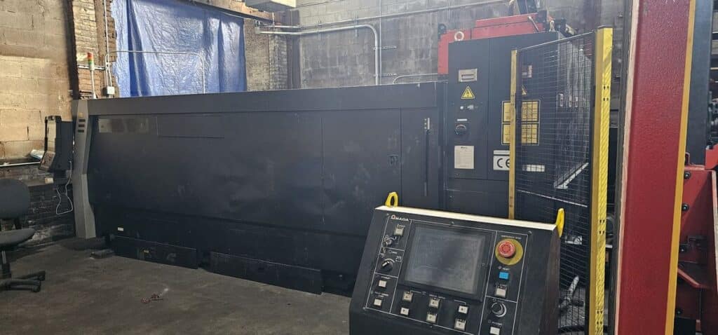 Amada AMNC 3i Control, ASFH 3015G Compact Load Unload System and Tower Storage, 4kW AJ4000L Fiber Resonator, Orion Chiller, Camfil Dust Collector