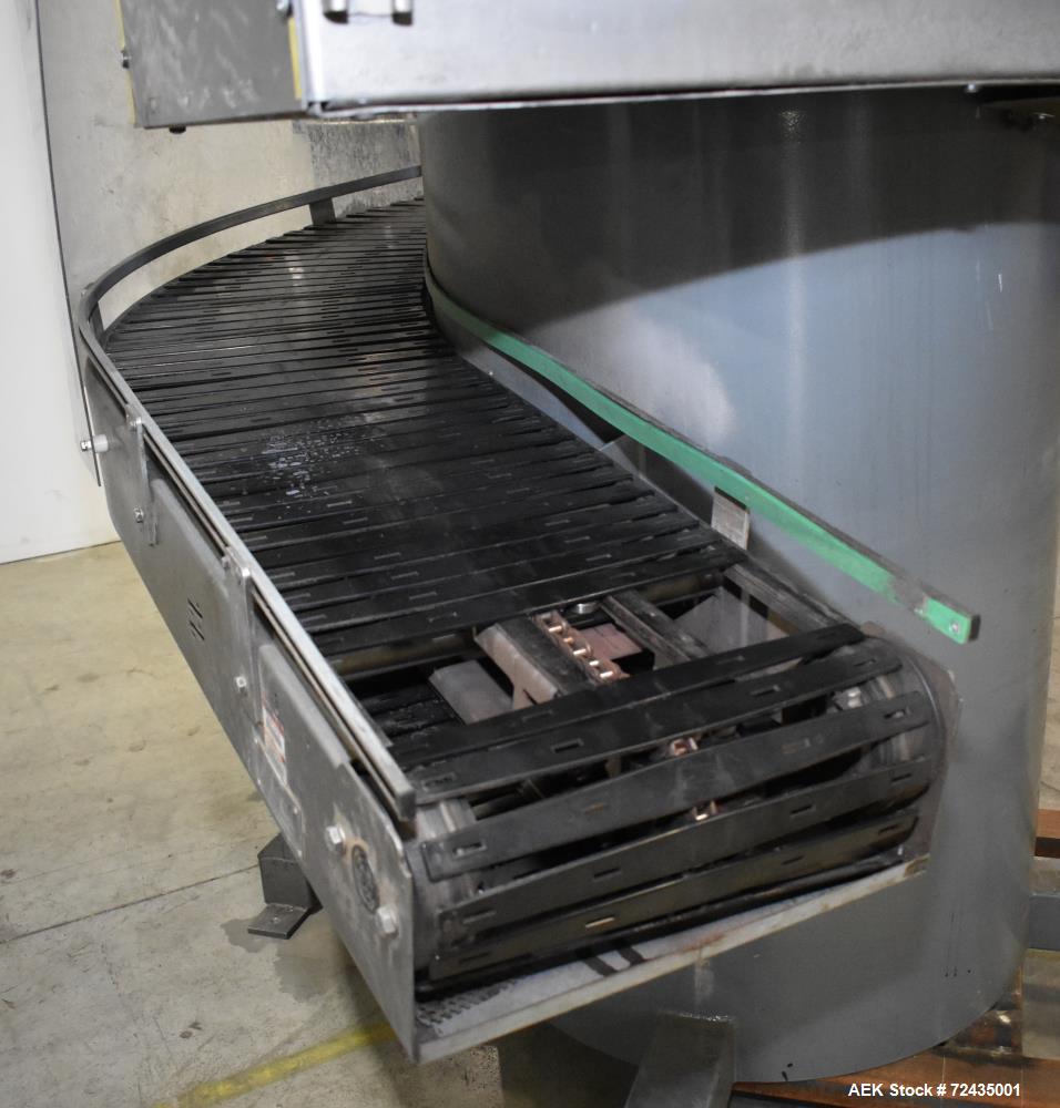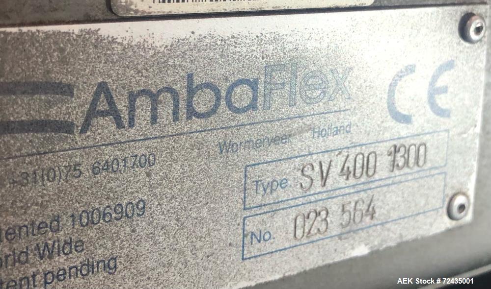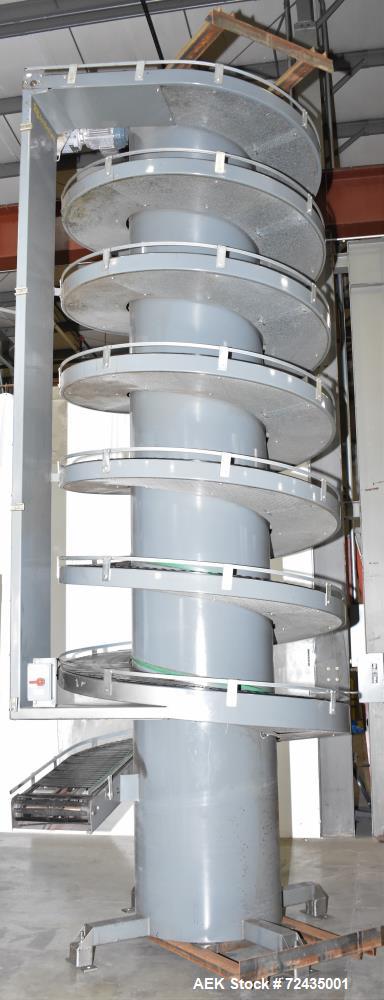 used- ambaflex model sv400-1300 spiral case conveyor. single belt, 16" (400mm) wide. approximately 17' tall. (6) 360 degree turns. g configuration. approximate 5'-7" square footprint. last used in nutritional drink filling operation. serial# 023 564. feeds product from bottom to top.