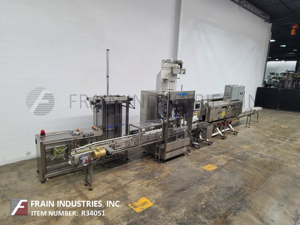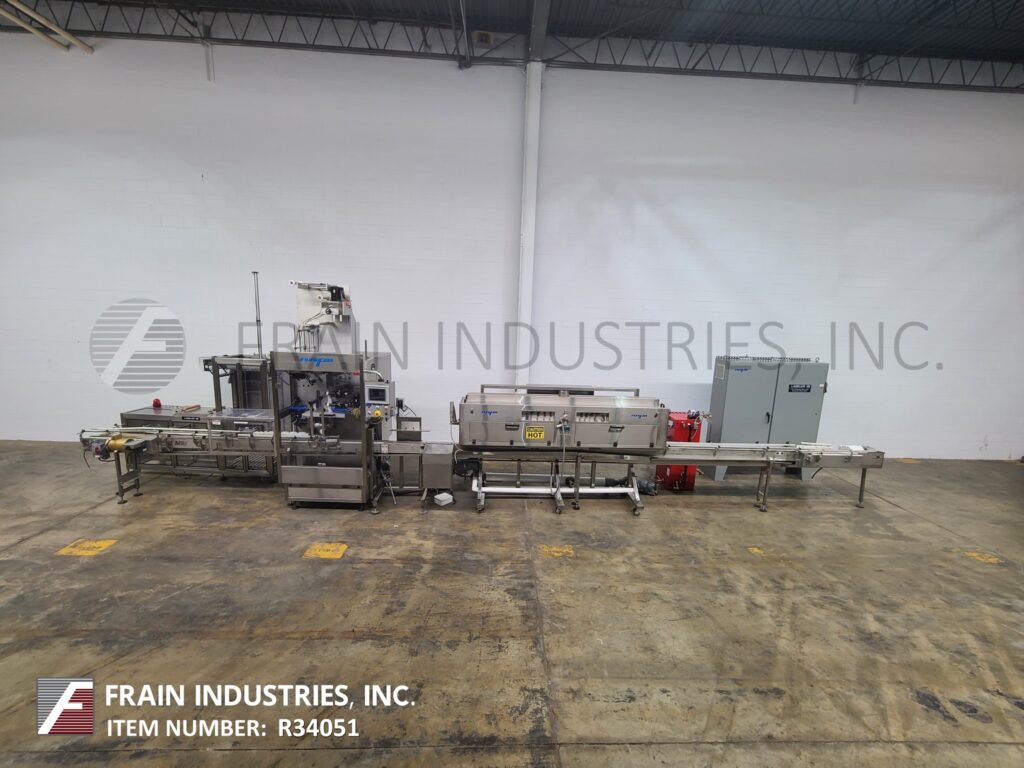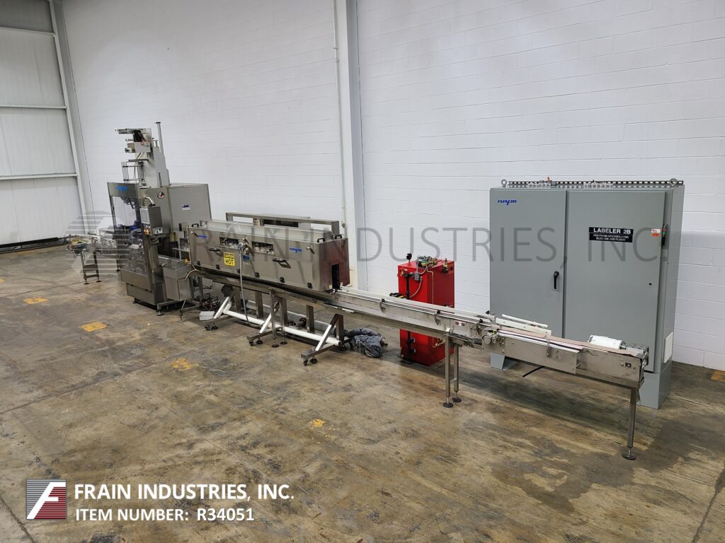 American Film & Machinery, Model LX-350SS and WSN-300, Automatic, stainless steel, tamper evident shrink neck bander or sleeve label applicator with stainless steel steam shrink tunnel. Rated from 50 to 350 container per minute – depending on materials, application and machine configuration. Layflat: 50mm to 240mm. Sleeve height: 40mm to 300mm. Film thickness: 0.035mm to 0.07mm. Equipped with 32" worm screw bottle indexing, dual roll splice station, forming tube, registration and knife film cut off. Control panel with AB PLC and touch screen HMI.