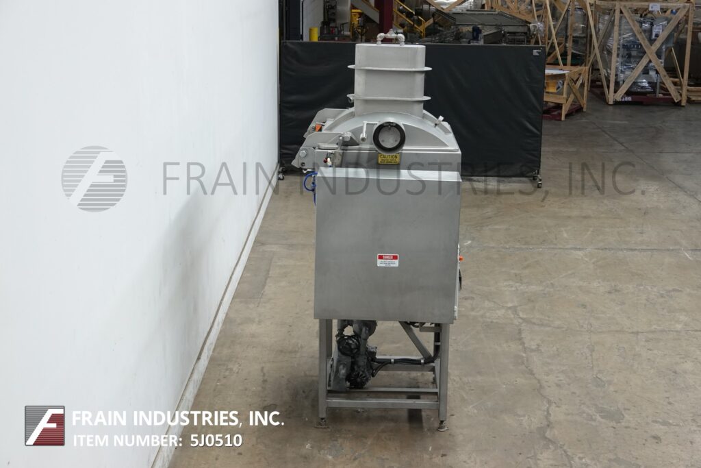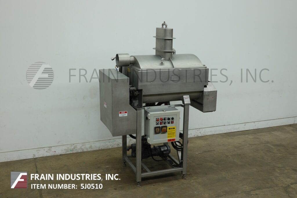 Amfec, Model 510, 15 ft³ (10 ft³ working capacity), 304 stainless steel dual trough vacuum ribbon mixer with pounds of product per hour – depending on materials and application. Equipped with dual mixing troughs with inner dimensions of: 41" in Length; 31" in Width; 21¼" in Depth. with 1½" wide x ¼" thick stainless steel single ribbons on 2" OD shaft, 2 hp vacuum pump, (2) 3 Hp motor drives with safety guarding and dual pneumatic discharge gates with 45" ground clearance. Control panel has push button start / stop, forward / reverse controls. Mounted on (4) stainless steel legs.