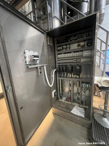 used anhydro micraspray 750 pilot spray dryer plant dairy application (2008). with capacity up to 165 lbs./ (75 kg/hour) milk powder. stainless steel on product contact parts. fluid atomizer type nozzle. incl. (1) cyclone, (1) slurry tank with agitator, frame mounted, (1) control panel. complete with piping, valves, sensors, and additional infrastructure. previously used in a dairy application. new year 2008. unit is natural gas heated. elec: 400volt/50cycle/3phases.