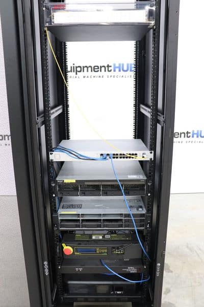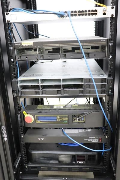 Occ 4 Port Fiber Box, Sonology RS1221RP+ 2U NAS, UniFi Switch 24 Port 250W 1U POE Switch, HP Enterprise SN/2M234301FB 2U Server, DLI Smart Power Switch 2U, Star Tech 8 Outlet 1U PDU, Trip-Lite UPS