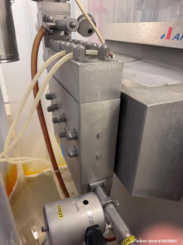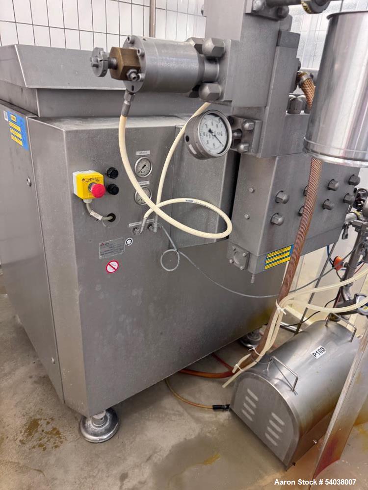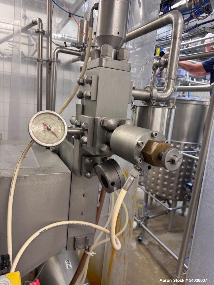 APV Model G110T-75P, stainless steel, (2) stage, (3) plunger homogenizer with working capacities to 14,000 litres or 3,696 gallons per hour – depending on materials, application and machine configuration. Maximum operating pressure up to 210 bar or 2,000 psi. (3) poppet, aseptic design, mechanical hydraulic ...more
