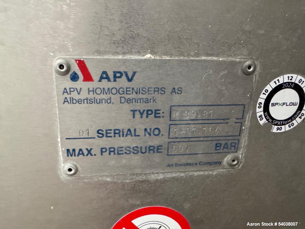 used apv homogenizer, model bt.30.81 | 600 bar / 9000 psi | stainless steel | high-pressure juice processing. max pressure 600 bar (9000 psi). incl. pump and additional infrastructure. last used in fruit juice concentrate operation. serial # 1-01.164. new year 2001. the unit is in production operation during 2025 and will become available for collection in 2026 definitive date to be arranged. our freight specialists can assist you with door to door transportation and all customs documents needed to make the process go as smoothly as possible.