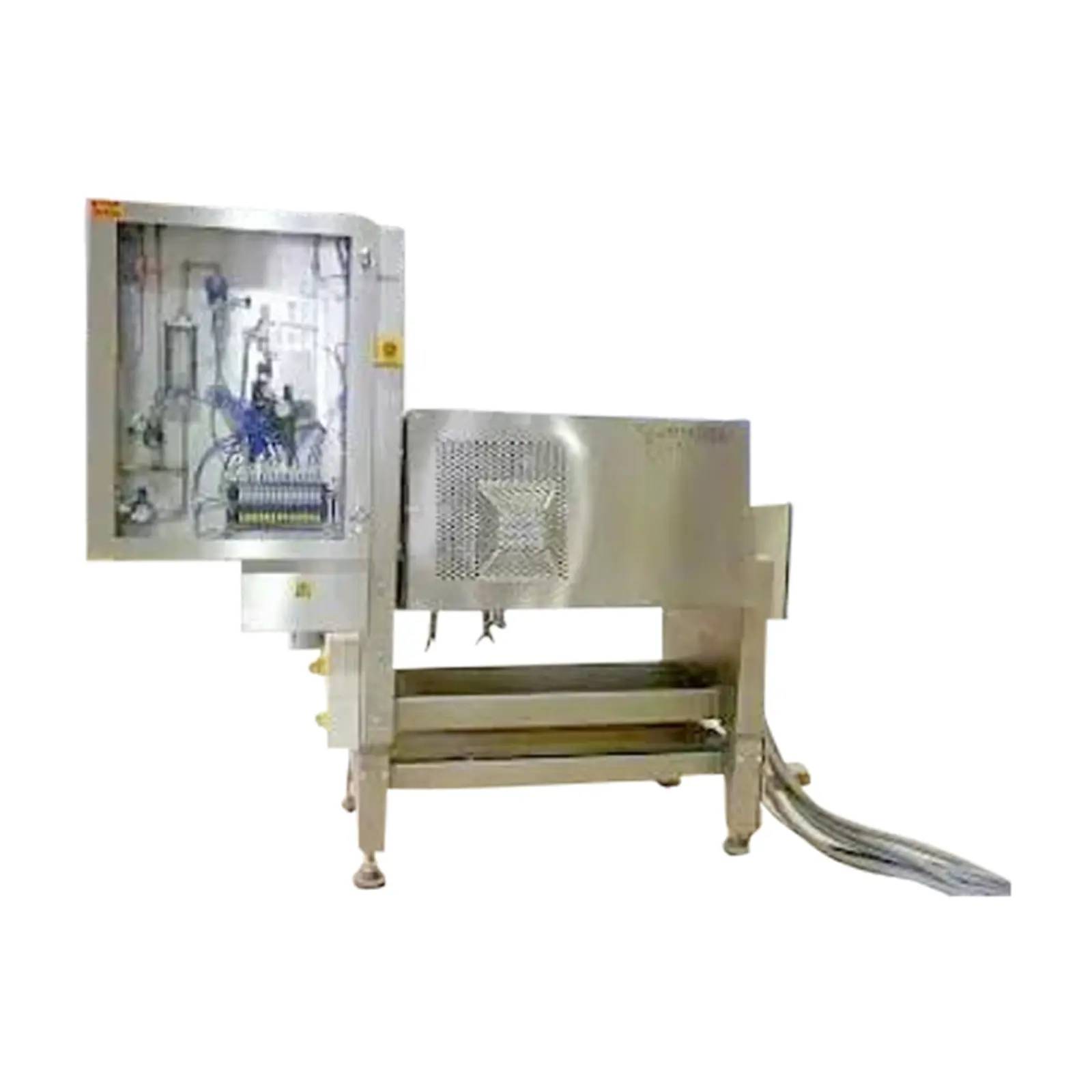 2000 APV Tweedy Dough Mixer with Inverter Control for Small Scale or Testing Applications. Model: T70 MIXER. Machine Number: 401/1. Year / Contract: 2000 AF990024. APV Stainless Control Panel S/N: AF990024. For Bakery applications, comes with 4 additional interchangeable mixing blade change parts. The Tweedy Mixer was originally a development of the Chorleywood Bread Process for a uniform, high-end dough product with user-friendly controls (Baker Perkins). Mixing Vessel designed for vacuum service, 19.75 in. dia. x 27.5 in. deep (4.875 Cu. Ft, ~36 gallons). The vacuum mixing option increases bread loaf volume, variable crumb texture, and structure. Maximum batch size: 54 Kg(119 lbs). Minimum batch size: 25 Kg (55 lbs). Maximum flour capacity: 32 Kg (70.5 lbs). Electrical Requirements: SEW 11 kW (14.7 HP), 1160 RPM, 230/460V, 3-phase (mixer motor). SEW 0.55 kW (0.73 HP), 230/460V, 3-phase (tilt function). 120V 1-phase (controls). Includes Allen Bradley AB PanelView 600 mounted in a stainless steel wash-down control cabinet (panel S/N: AF990024). Pump is manufactured by The Utile Engineering Co. Ltd, model D26, S/N: M 104418. Allen Bradley Rockwell manuals for controls, modules, power supplies, VFD units, etc included. Refer to the PDF file link below for more pictures of what is included. (ACN1700)
