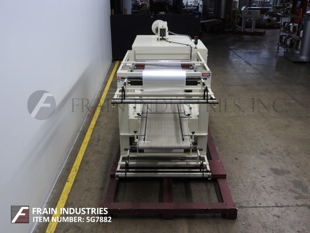 Arpac, Model 105-36TW, Inline, intermittent motion, shrink bundler and tunnel. Rated from 1 to 25 bundles per minute – depending on materials and application. Equipped with 27" wide x 45" long Intralox in feed conveyor, 27" wide x 24" long Intralox spacing conveyor, 36" wide film rolls, 37" wide seal jaws with 14¾" vertical travel, 30" wide x 20" long Intralox transfer conveyor to shrink tunnel. Single zone shrink tunnel has 36” wide x 19" high total aperture x 60" long with100" long x 37½" wide Intralox product conveyor and cooling fan. Control panel has AB controller, with touch pad controls and readout, start / stop / e-stop / manual seal push button controls and digital temperature controls for seal bar and tunnel. Mounted on heavy duty base frame.