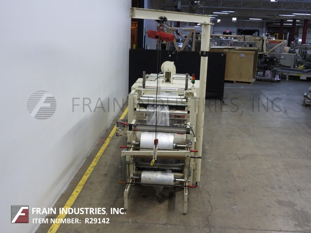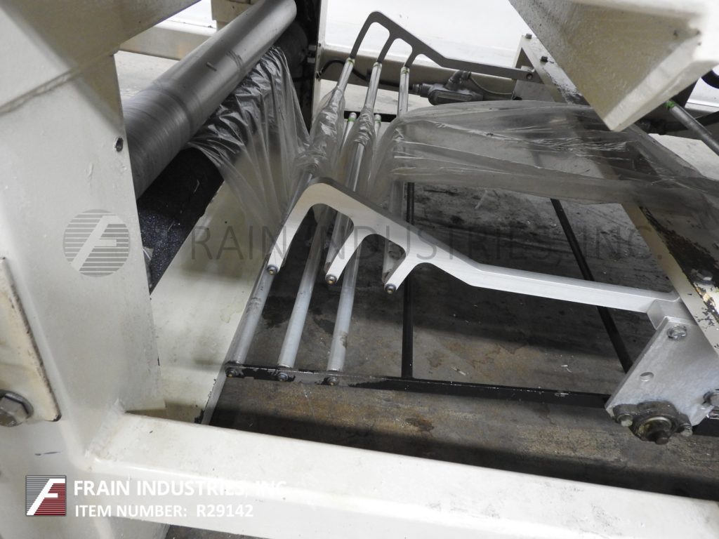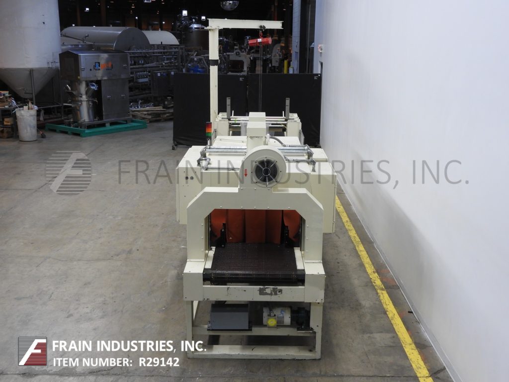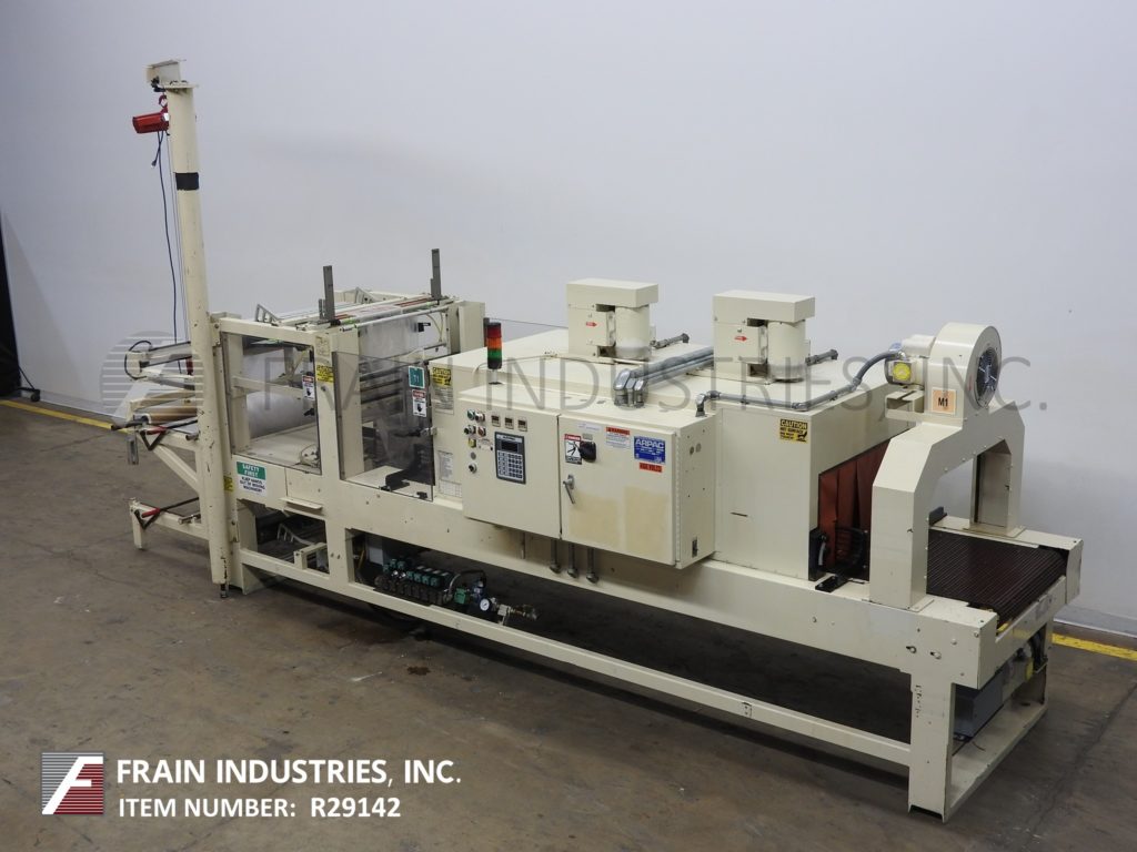 Arpac, Model 108-28 TW, right angle shrink bundler. Rated from 10 to 20 bundles per minute – depending on materials, application and machine configuration. Equipped with 10" wide x 40" long in feed conveyor, film hoist, 90° product pusher, 29" wide hot knife seal jaws with 10" vertical travel and bundle hold down tamp. 83" long single zone shrink tunnel has 30” wide x 16" high total aperture, 128" long x 29" wide product conveyor and cooling fan on discharge. Control panel with AB controller, touch pad controls with readout, start / stop / e-stop / manual seal push button controls and digital temperature controls for seal bar and tunnel. Mounted on heavy duty base frame.
