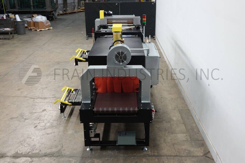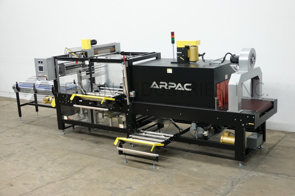 Arpac, Model 45TW-28, inline, intermittent motion, bundler and integrated shrink tunnel – speed dependent on materials, application and machie configuration. Equipped with 70" long x 24" wide in feed conveyor, 29" wide seal jaw with 12" vertical travel, side mounted film racks and splice station, 66" long x 17" wide transfer conveyor through seal and into single zone shrink tunnel with 29" wide flex link conveyor and 28” in width x 16" in height aperture and 70" long chamber, top mounted blower motor and cooling blower at discharge. Allen-Bradley controller with PanelView operator interface and color touch screen, message display and self-diagnostics, low film alert, bypass mode – allows product to pass through the machine without being wrapped and without heating the tunnel. Film rolls up to 28" in width; and 14" OD on 6" core. Mounted on heavy duty frame with status light bar and interlocked safety guarding.