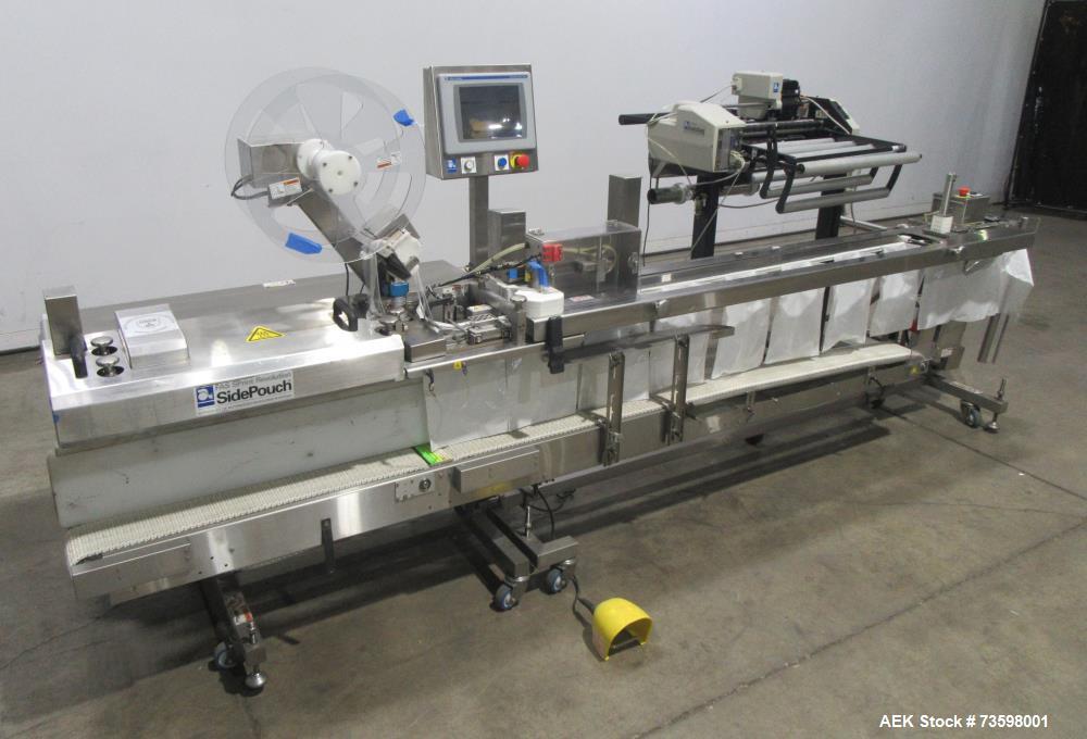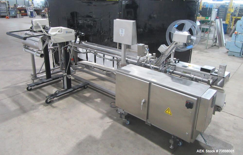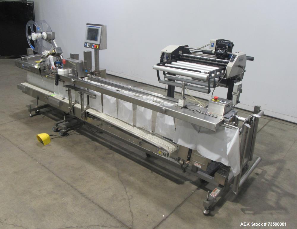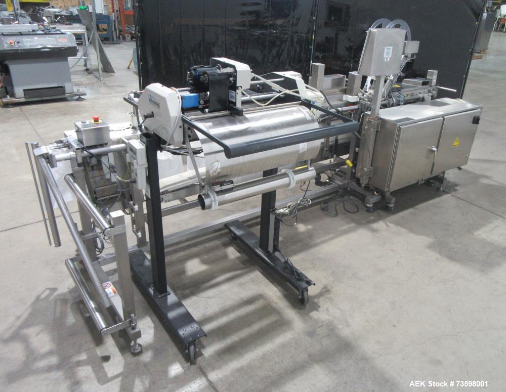 used automated packaging systems model fas sprint revolution bagger. 60" wide load area, 6" pass-through. 1.5 to 4.0 mil bag thickness. ag thickness; 2" to 24" wide, 3" to 18.75" long. up to 900 inches per minute (bags per minute determined by bag size). up to 15 pounds per bag (with support conveyor). stainless steel construction, mounted on casters. includes optional product support conveyor, id technologies model 250 print and apply labeler with zebra model 110pax4 print engine.