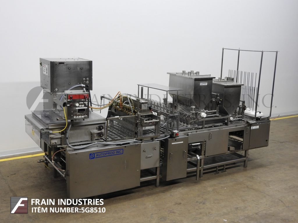 Autoprod, Model FP – 1×8, Automatic, inline, stainless steel cup filler and die cut heat sealer. Rated from 10 to 30 cycles or 80 to 240 cups per minute – depending on materials, application and machine configuration. Denests, fills and heat seals pre-cut foil to cups, currently set to do 1 x 8 pattern on 3¾” centers. Equipped with cup denster with 21" vertical magazine, 8-head rotary valve depositor with 16" long x 30"wide x 22" deep product hopper, 8-head piston filler with positive cut off and 16" long x 30" wide x 22" deep product hopper, reciprocating pre-cut foil pic-n-place and heat-sealing section. Control panel with push button start / stop / E-stop, (8) digital temperature controllers and on / off switches for cup denest, filler 1, filler 2, lid picker, heat sealer, and heaters.